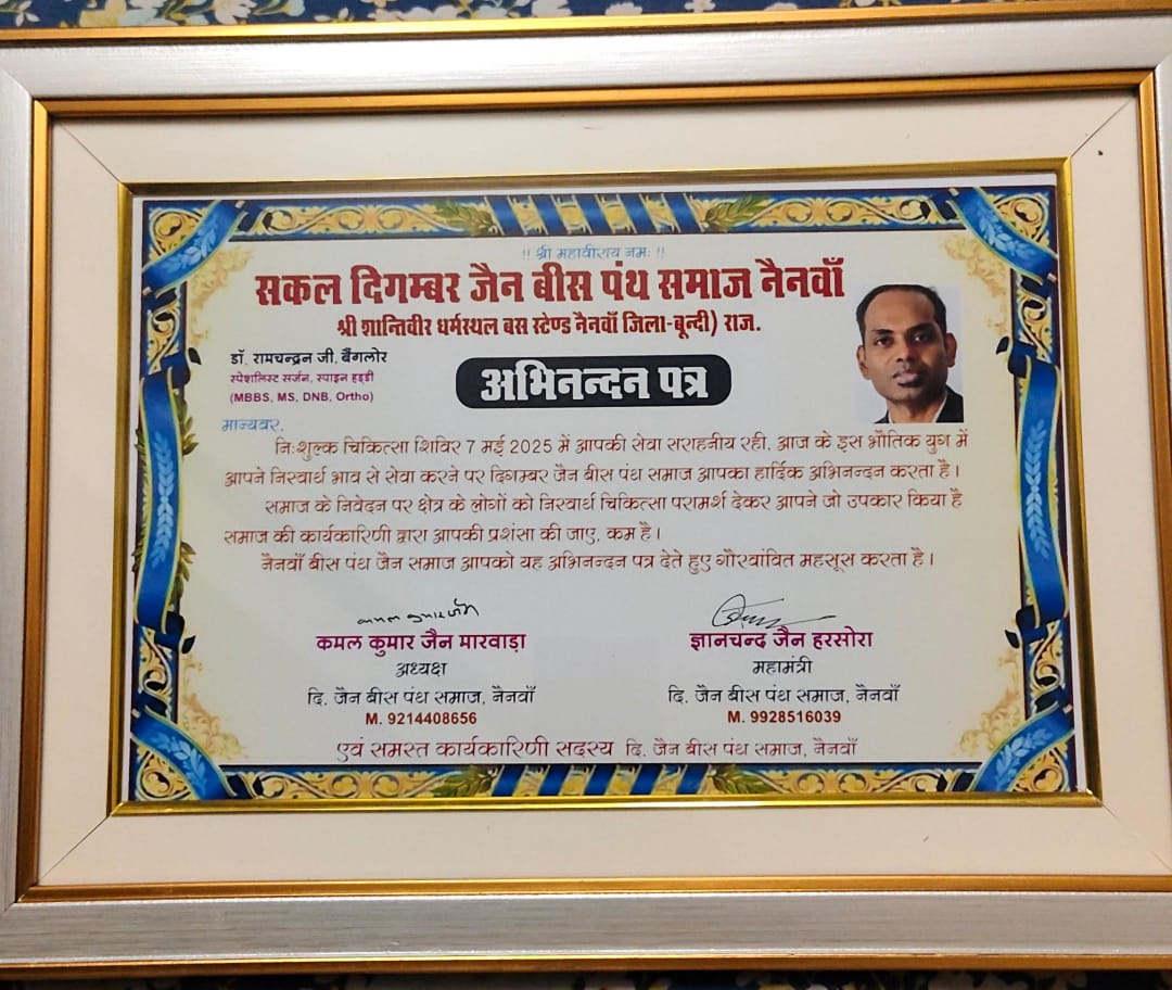 दिगंबर जैन समाज के अध्यक्ष कमल कुमार जैन मारवाड़ा ने डॉक्टर रामचंद्रन को उनकी सेवाओं के लिए आभार व्यक्त किया और अभिनंदन पत्र भेंट किया।