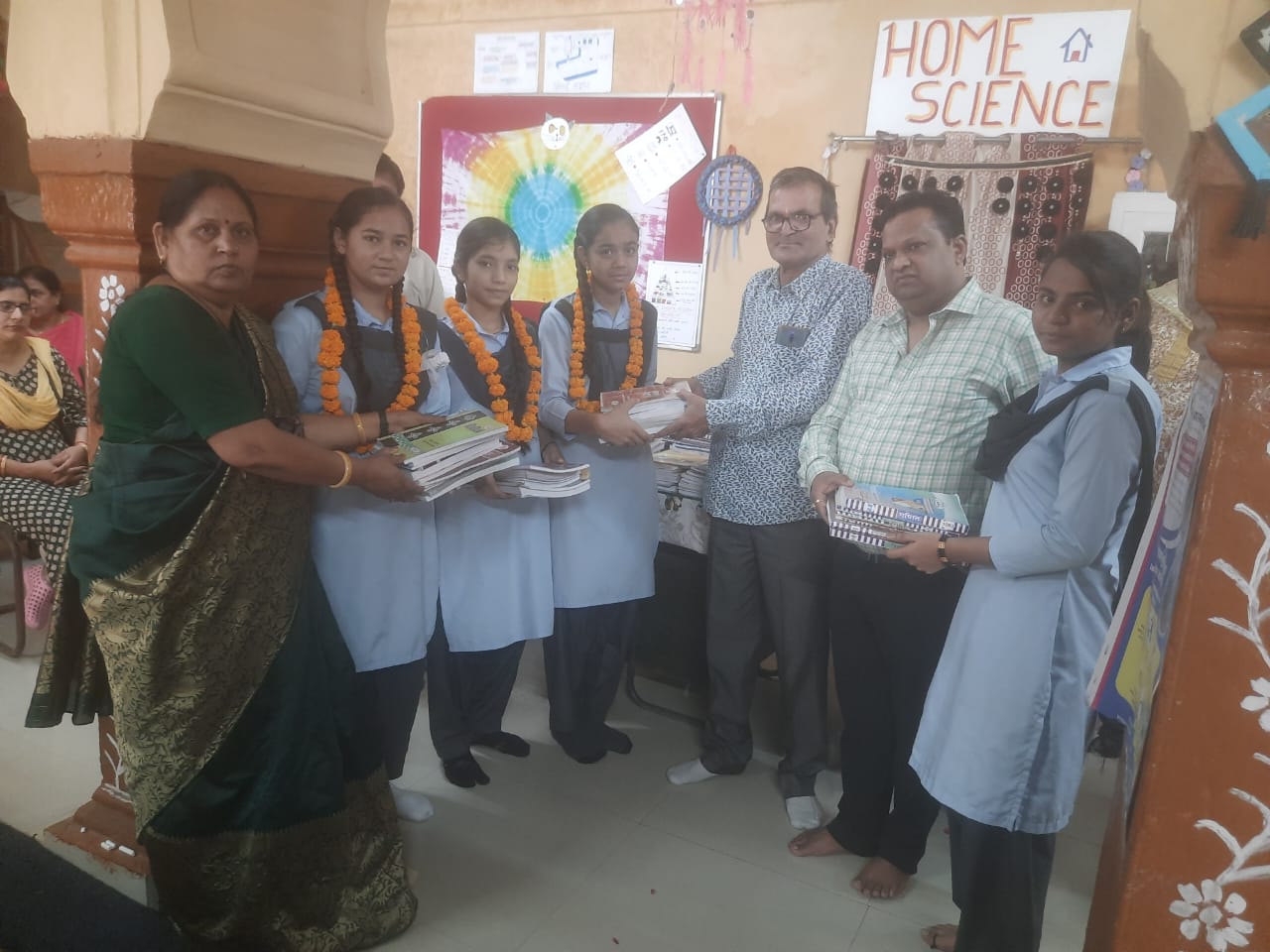 जयपुर राजकीय महाराजा बालिका उच्च माध्यमिक विद्यालय छोटी चैपड जयपुर में आज राज्य सरकार द्वारा निःशुल्क पाठ्य पुस्तक वितरण समारोह के अन्तर्गत राज्य सरकार द्वारा चलाई जा रही योजना के तहत कक्षा प्रथम से कक्षा बारहवीं तक की बालिकाओं को पाठ्य पुस्तक का वितरण किया गया। कार्यक्रम की अध्यक्षता करते हुये विद्यालय प्राचार्य श्रीमती पुखराज आर्य ने राज्य सरकार द्वारा चलाई जा रही निःशुल्क योजनाओं को बालिकाओं को अवगत कराया। कार्यक्रम के मुख्य अतिथि अखिल भारतीय नाटाणी परिवार समिति के राष्ट्रीय महामंत्री एवं विद्यालय विकास प्रबंधन समिति के सदस्य गोविन्द नाटाणी विघायक प्रतिनिधि संजय अग्रवाल सहित विद्यालय के शिक्षक एवं गणमान्य व्यक्ति उपस्थित रहे।