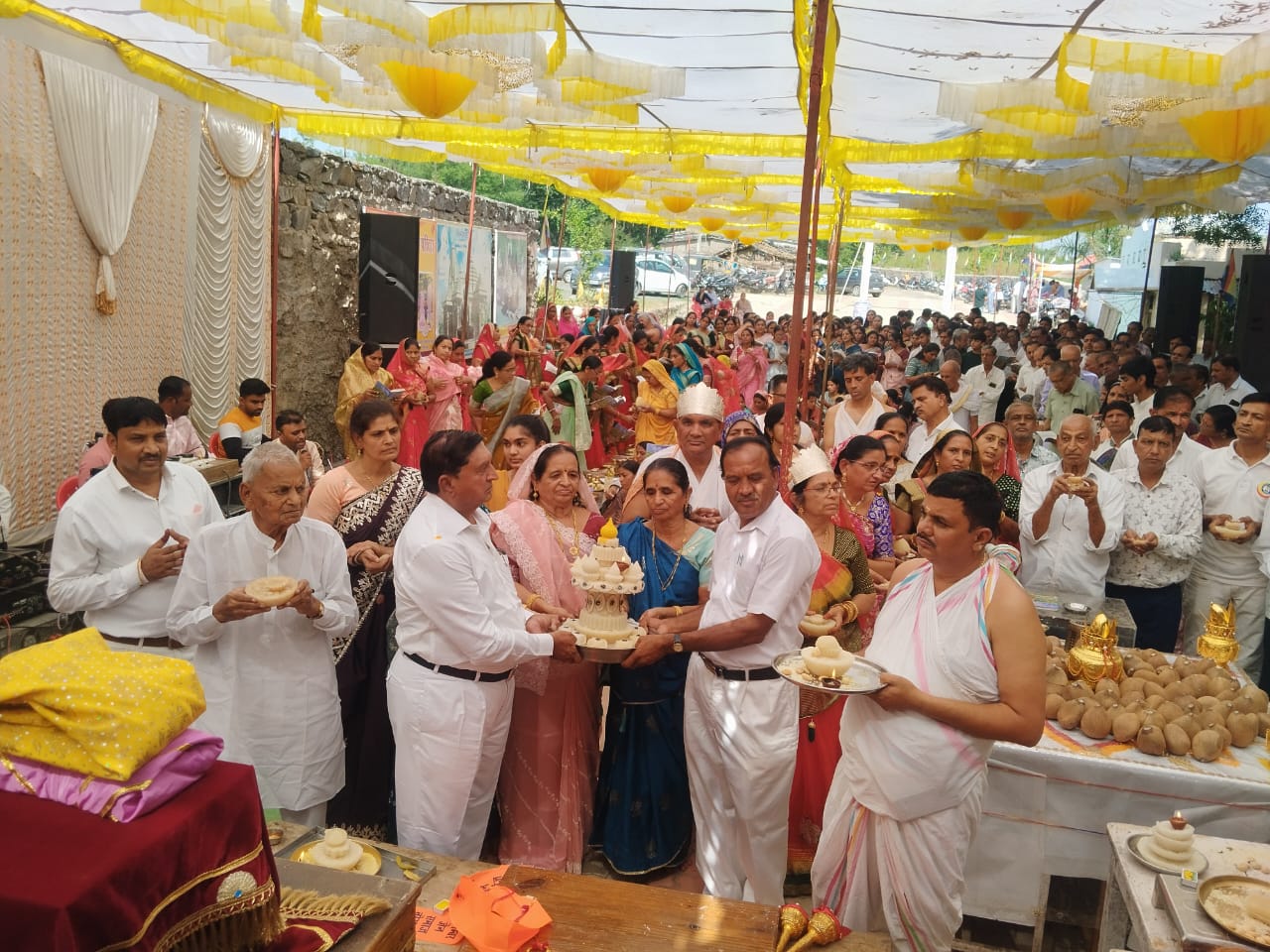 नौगामा नगरी में हर वर्ष की भांति इस वर्ष भी सुखोदय तीर्थ नसियाजी में भव्य निर्वाण मेले का आयोजन किया गया कार्यक्रम में समाज के प्रवक्ता सुरेश गांधी ने बताया कि 2 नवम्बर को प्रातः आदिनाथ मंदिर समवशरण मंदिर जी में अभिषेक एवं महाशांती धारा के बाद बैंड बाजो के साथ श्रीजी को पालकी में विराजमान कर विशाल जन समूह के साथ सुखोदय तीर्थ लाया गया जहां पर श्री जी को गंनगोटी में विराजमान कर अभिषेक किया गया कार्यक्रम में ब्रह्मचारी विजय भैया, पंडित रमेश चंद्र गांधी, वीणा दीदी, प्रियंका दीदी के दिशा निर्देशन मेंमंगलाचरण के पश्चात ध्वजारोहण की क्रियाएं की गई ध्वजारोहण करने का प्रथम सौभाग्य गांधी मयूर अजीत कुमार को प्राप्त हुआ उसके पश्चात माताजी का आगमन हुआ माता जी की सानिध्य में सम्मेद शिखर विधान की पूजन की गई पूजन के पश्चात विधान पर 62 अर्घ्य अर्पित कर इस अंतराल में सुखोदय मैं स्थित 24 टोंक पर नवीन रजत मय धर्म ध्वजा चढ़ाई गई एवं मानस्तंभ, एवं भगवान महावीर की प्रतिमा, मुख्य मंदिर, सहित सात गुफाओं में निर्वाण लाडू चढ़ाया गया, लाडू चढ़ाने का प्रथम सौभाग्य विरोदय कमेटी के अध्यक्ष पिंडारमिया मोहनलाल छगनलाल को प्राप्त हुआ ,इस पावन अवसर पर वात्सल्य भोज के प्रदाता श्रीमान कवि उत्सव जी गांधी परिवार रहे। विधान के अंतराल के बीच आगामी दिनों में होने वाले सर्वतो भद्र विधान की बोलियां लगाई गई जिसमें चक्रवर्ती, सोधर्म इंद्र, भरत – बाहुबली, कुबेर इंद्र, ईशान इंद्र, अष्ट कुमारिया, लोकांतिक देव आदि की बोलिया विभिन्न वाद्य यंत्रों के मधुर स्वर लहरों के साथ गायक राजेश जैन और पार्टी के भजनों के साथ बोलिया की गई ज्ञात रहे की दिनांक 9 नवंबर से 19 नवंबर तक सर्वतोभद्र विधान नोगामा नगर में आयोजित किया जा रहा है एवं दिनांक 18 नवंबर को भव्य पिच्छिका परिवर्तन समारोह का कार्यक्रम रखा गया है इस अवसर पर बागीदौरा प्रधान विजय भैया, पंडित रमेश चंद्र गांधी, संयम शास्त्री, समाजसेवी महिपाल दोसी ,वीरोदय कमेटी के अध्यक्ष मोहनलाल जैन, छात्रावास कमेटी के अध्यक्ष निलेश जैन, उपाध्यक्ष राजेंद्र गांधी, नरेश जैन ,सुभाष नानावटी, डॉ अजीत गांधी, सुरेश चंद्र गांधी सहित सभी आगंतुक अतिथियों को तिलक लगाकर, माला, दुपट्टा ,पहनाकर पगड़ी पहनाकर भव्य सम्मान किया। उक्त जानकारी प्रवक्ता सुरेश चंद्र गांधी द्वारा दी गई।