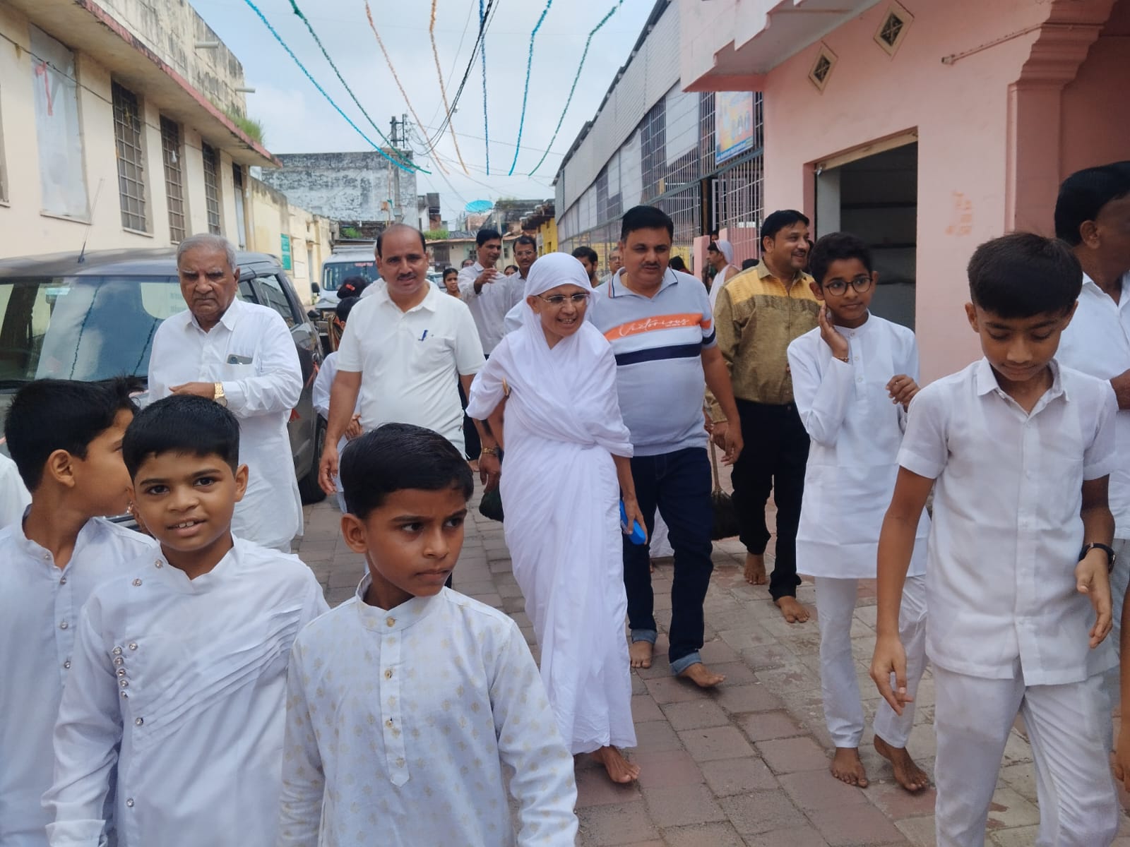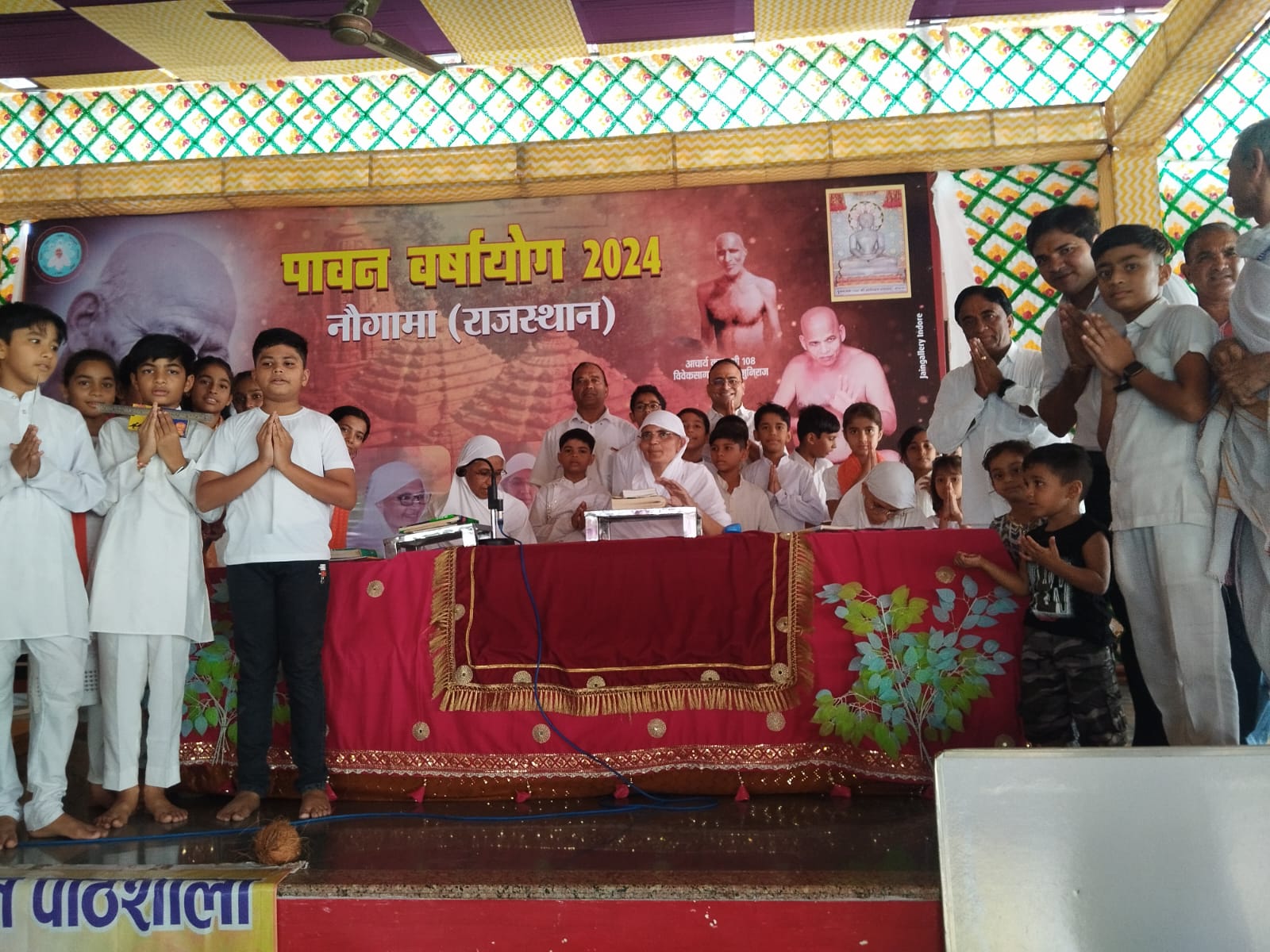 नौगामा में परम पूज्य विज्ञान मति माताजी की सुयोग्य शिष्या 105 पवित्रमति माताजी, गरिमाकरण मति माताजी का मंगल चातुर्मास नौगामा नगर में भव्यता के साथ चल रहा है चातुर्मास के तहत 1 सितंबर रविवार को 1008 आदिनाथ दिगंबर जैन मंदिर, 1008 भगवान महावीर समवशरण मंदिर जी विशेष शांति धारा, अभिषेक के बाद चातुर्मास पंडाल में मंगल प्रवचन हुआ जहां पर आर्यिका श्री ने अपने मंगलमय उद्बोधन में श्रावकों को बताया कि मनुष्य के बुरे कर्मों के कारण विनाशकाले विपरीत बुद्धि आती है उस समय उसके पापों का उदय होता है तो अच्छे कार्य करने जाओ तो भी उसकी बुद्धि बुरे कार्यों की ओर दौड़ती है इसलिए हमेशा जीवन में सदैव अच्छे कार्य करने चाहिए बुरे कार्यों से दूर रहना चाहिए, माताजी ने “लब्धि विधान” की महिमा बताई जो कि प्रतिवर्ष इस माह के चतुर्थी के दिन से शुरू होता है और यह विधान तीन दिन तक चलता है आज प्रवचन से पूर्व जैन पाठशाला के छात्रों द्वारा सामूहिक रूप से पूजन की गई व मंगलाचरण किया गया एवं डडुका नगर से पधारे जैन पाठशाला के छात्र एवं उनके अध्यापक अजीत जी कोटिया, मनोज जैन हाडर्पिपलिया, मध्य प्रदेश से पधारे विजय जी छाबड़ा, सुमित जी छाबड़ा का चातुर्मास कमेटी की ओर से अध्यक्ष निलेश जैन, राजेंद्र गांधी, नरेश जैन द्वारा पगड़ी पहनाकर दुपट्टा लगा कर सम्मान किया गया एवं उन अतिथियों द्वारा दीप प्रज्वलित किया गया, प्रवचन के बाद गरिमामती माताजी द्वारा प्रश्न मंच किया गया एवं प्रश्न मंच का पुरस्कार दोषी मनीष जयंतीलाल द्वारा दिया गया कार्यक्रम का संचालन दीपक पंचोली द्वारा किया गया उक्त जानकारी जैन महासभा के प्रतिनिधि राजाबाबू गोधा को जैन समाज प्रवक्ता सुरेश चंद्र गांधी द्वारा दी गई।