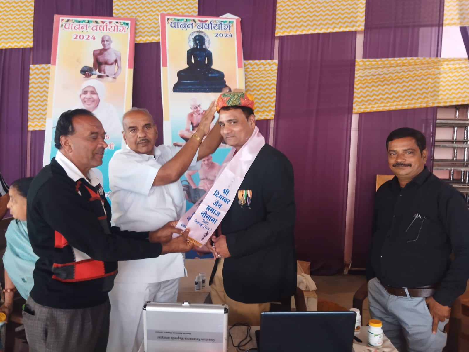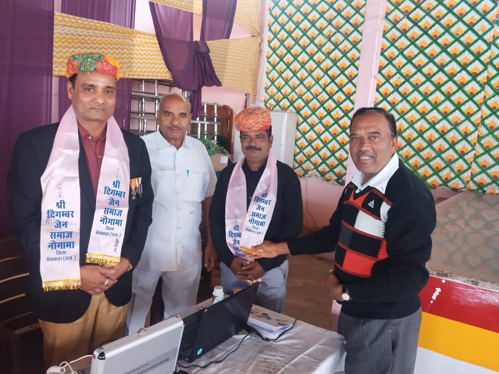 नौगामा शहर में जैन समाज के पंडाल में सोमवार 22 दिसम्बर को अहमदाबाद के हेल्थ केयर हॉस्पिटल के डॉक्टर थैरेपिस्ट एक्सपर्ट जे के जैन द्वारा आयुर्वेदिक पद्धति से इलाज हेतु कैंप का आयोजन किया गया इसमें स्वस्थ हड्डियां ,स्वस्थ शरीर हड्डियों से तकलीफ हेतु घुटनों, कमर, स्नायु दर्द, गैस ,कब्ज , एसिडिटी ,माइग्रेन सहित विभिन्न बिमारियों का डॉ राजेंद्र जैन द्वारा BND मशीन के द्वारा एनालिसिस कर आयुर्वेदिक पद्धति से हर्बल दवाइयां के माध्यम से इलाज हेतु सलाह दी गई ,इस अवसर पर दिगंबर जैन समाज द्वारा डॉक्टर साहब को पगड़ी, दुपट्टा पहनाकर सम्मानित किया गया कार्यक्रम में जैन समाज के प्रवक्ता सुरेश चंद्र गांधी जीतमल ,शांतिलाल जी, जयप्रकाश, रोनी दोसी ,नरेश शांतिलाल महेंद्र गांधी, दीपक जी मैनेजर बांसवाड़ा से पधारे अश्विन मलोट एवं उपस्थित सभी बंधुओ ने स्वागत अभिनंदन किया इस अवसर पर डॉक्टर साहब ने कहा कि प्रति माह फॉलो अप कैंप लगाया जाएगा।