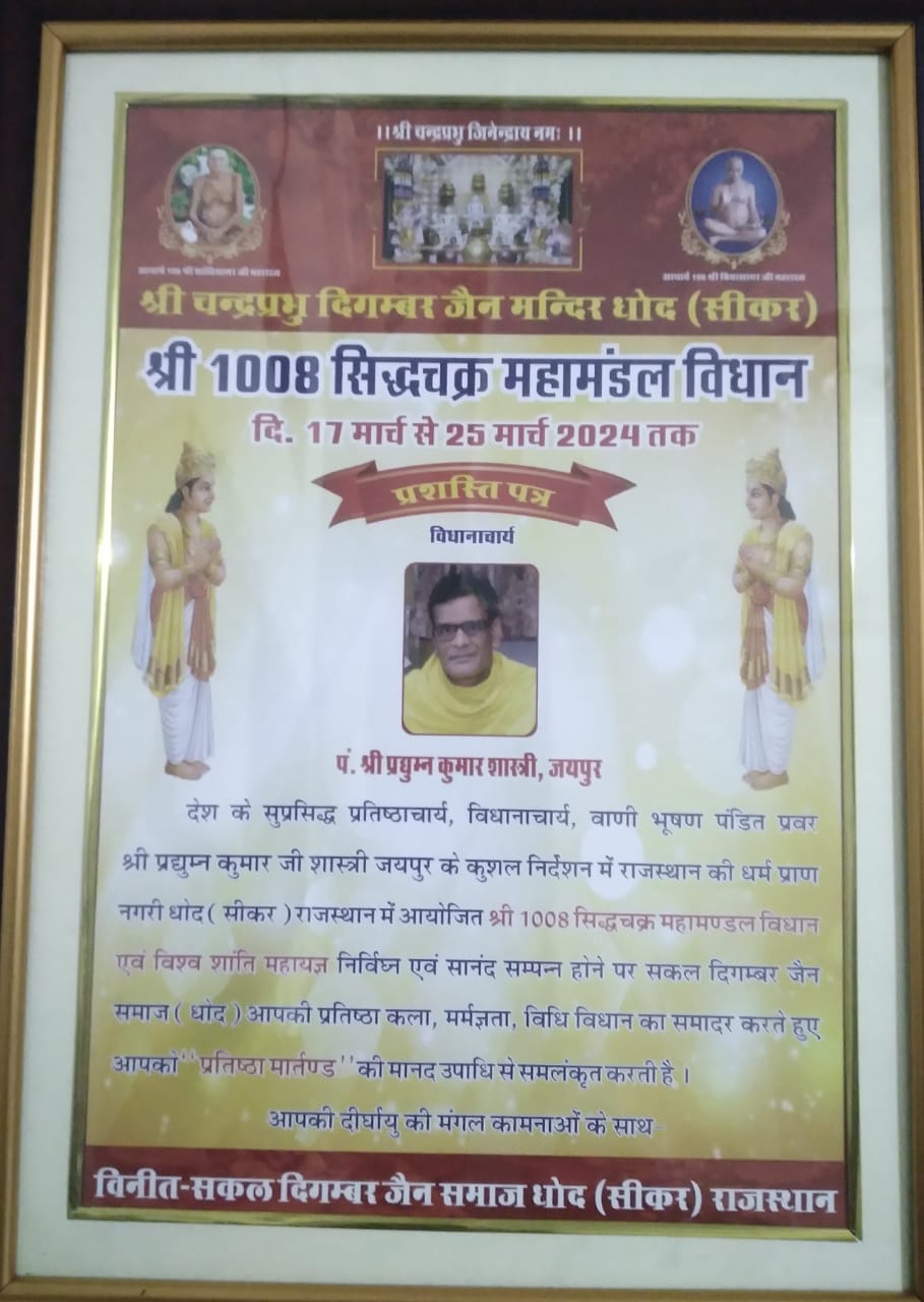धोद। श्री दिगम्बर जैन मंदिर धोद सीकर राजस्थान में श्री सिद्धचक्र महामण्ङल का ऐतिहासिक आयोजन दिनांक 17 से 25 मार्च 2024 तक आयोजित किया गया जिसमे लगभग 500 इन्द्र- इन्द्राणियो ने भक्ति-भाव से सिद्धों की पूजा अर्चना की। विधान की विशेषता ये रही कि इसमे देश के कौने कौने से भक्त पहुचे थे।दिल्ली, मुम्बई , बैगलूर, कोलकाता ,इम्फाल, जयपुर ,सीकर, गोहाटी आदि से आकर भक्तो ने कार्यक्रम को ऐतिहासिकता प्रदान की । सम्पूर्ण कार्यक्रम को पं प्रद्युम्न कुमार जैन शास्त्री मोहनबाङी जयपुर ने अपने कुशल निर्देशन से भव्यता एवं दिव्यता प्रदान की।