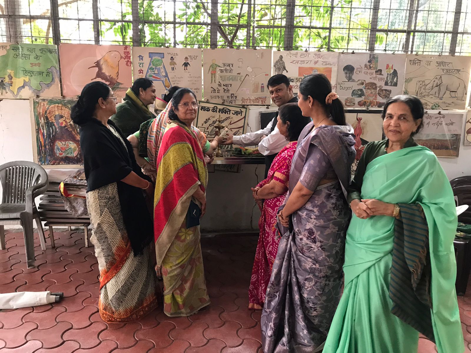 चित्रकार शाकाहार के प्रचार प्रसार को समर्पित पुष्पा पांड़्या, विजया पहाड़िया ,पुष्पा कटारिया व इंद्रा अजमेरा द्वारा संयोजित जीव दया , मानव सेवा अहिंसा व पर्यावरण हितेशी हस्त निर्मित शाकाहार प्रर्दशनी का परम पूज्य मुनि प्रमाण सागर महाराज संसघ ने अवलोकन किया। और हमारे इस कार्य की मुनि संसघ अनुमोदना की व आशीर्वाद दिया। राजेश जैन दद्दू ने कहा कि