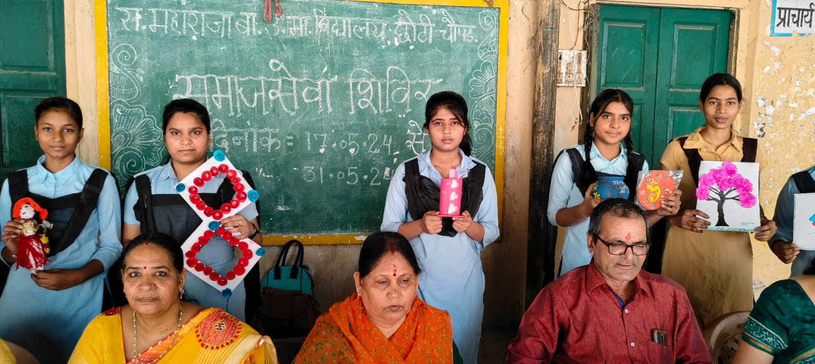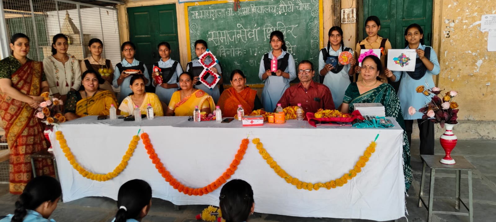 राजकीय महाराजा बालिका उच्च माध्यमिक विद्यालय छोटी चैपड किशनपोल बाजार की प्रधानाचार्य श्रीमती पुखराज आर्य ने बताया कि बालिकाओं के समग्र विकास हेतु 17 मई 2024 से 31 मई 2024 तक विद्यालय प्रांगण में समाज सेवा शिविर का आयोजन किया गया। समाज सेवा शिविर में पर्यावरण एवं स्वच्छता विषय पर एवं समग्र विकास हेतु स्किल डवलपमेंट हेतु छात्राओं द्वारा विभिन्न प्रोजेक्टों पर प्रस्तुतियां की एवं पर्यावरण एवं स्वच्छता का संदेश देते हुये विभिन्न प्रकार की प्रतियोगिताएंे आयोजित की गई। समापन से पूर्व समाज सेवा शिविर में अखिल भारतीय नाटाणी परिवार समिति के राष्ट्रीय महामंत्री एवं विद्यालय विकास प्रबन्धन समिति के गोविन्द नाटाणी द्वारा समाज सेवा शिविर में आयेाजित प्रतियोगिता में प्रथम, द्वितीय और तृतीय स्थान पर आने वाली छात्राओं को पुरस्कार देकर सम्मानित किया गया एवं समाज सेवा शिविर में सम्मिलित सभी छात्राओं को पुरस्कार देकर प्रोत्साहित किया गया।