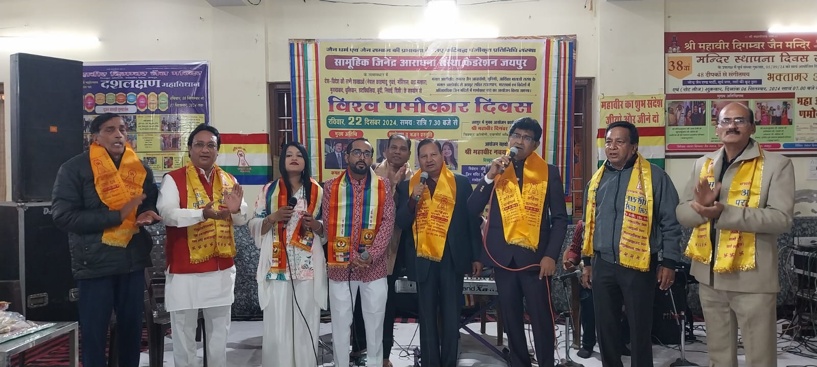के तत्वावधान में देश-विदेश की सभी शाखाओं (नेपाल काठमांडू, दुबई, मॉरिशस, बड़ा मल्हारा, मुरादाबाद, धुलियान, हाटपिपलिया, बूंदी, निवाई, दिल्ली) के सहयोग से रविवार 22 दिसंबर को रात्रि 7.30 बजे से विश्व णमोकार दिवस हर्षोल्लास पूर्वक मनाया गया, कार्यक्रम में संस्था के अध्यक्ष राकेश- नीलू गोधा और महामंत्री धीरज- सीमा पाटनी ने बताया कि इस महत्वपूर्ण आयोजन के लिए समस्त जैन आचार्यश्री, मुनिश्री, आर्यिका माताजी ससंघ के मंगल आशीर्वाद से जयपुर सहित राजस्थान, सहित सम्पूर्ण भारतवर्ष में एवं विदेशों में 500 से भी अधिक जिन मंदिरों में णमोकार पाठ एवं भजन संध्या का आयोजन किया गया।विश्व णमोकार दिवससंस्था के कोषाध्यक्ष संजय काला एवं मुख्य समन्वयक भरत जैन के अनुसार जयपुर में विश्व णमोकार दिवस पर मुख्य आयोजन श्री महावीर दिगंबर जैन मंदिर चित्रकूट कॉलोनी, एयरपोर्ट सर्किल, सांगानेर, जयपुर में बड़े ही उत्साह के साथ किया गया। कार्यक्रम के मुख्य अतिथि प्रसिद्ध युवा समाजसेवी कमल सुधा- सरावगी एवं मंदिर जी प्रबंध समिति के केवल चंद गंगवाल, मंत्री अनिल बोहरा, राकेश गोधा, धीरज पाटनी, संजय काला , गायक अशोक गंगवाल, गायक कुचामन से आए गौरव- खुशबू जैन ने दीप प्रज्वलन कर कार्यक्रम की मंगलमय शुरुआत की।तत्पश्चात बड़ी ही भक्ति भावना से गायक अशोक गंगवाल, कुचामन सिटी के युवा गायक गौरव खुशबू जैन ने नमोकार पाठ से सभी को जोड़ा, उसके बाद भक्ति रस की रचनाओं से पूरा मंदिर हॉल परिसर गुंजायमान कर दिया।