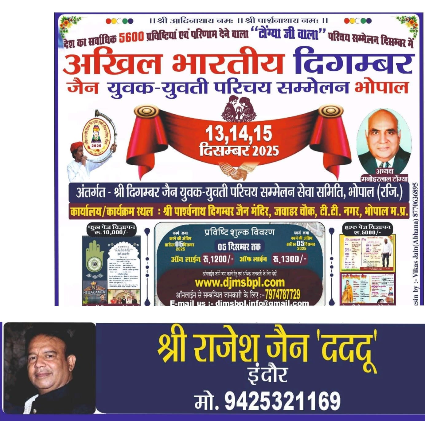 प्रदेश की राजधानी भोपाल में विश्व प्रसिद्ध दिगंबर जैन समाज का टोंग्या जी वाला युवक युवती परिचय सम्मेलन 13 से 15 दिसंबर 2025 आयोजित होने वाले सम्मेलन में अभी तक 3100 रजिस्ट्रेशन हो चुके हैं और अभी रजिस्ट्रेशन चालू है परिचय सम्मेलन इंदौर के संयोजक राजेश जैन दद्दू ने बताया कि इस बार हम 5000 से अधिक युवक युवती के परिचय स्मारिका में प्रकाशित होने का विश्वास है। ददू ने बताया कि सम्मेलन के अध्यक्ष मनोहर लाल टोंग्या एवं महामंत्री इंजिनियर विनोद जैन निर्णय.लेते हुए कहा कि जैन समाज का सबसे बड़ा परिचय सम्मेलन जीरो वेस्ट होगा। पुरे सम्मेलन स्थल पर पानी के लिए