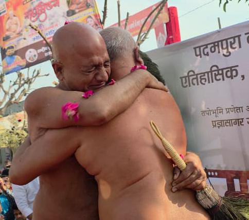 पदमपुरा/कोडरमा**जयपुर नगरी में अतिशय कारी पदमपुरा के अतिशय क्षेत्र में आचार्य श्री पुष्पदंत सागर जी के शिष्य आचार्य श्री प्रज्ञा सागर जी (6 पीछी) तथा आचार्य श्री प्रसन्न सागर जी (18 पीछी) का आगमन हुआ। आचार्य श्री 108 वर्धमान सागर जी ससंघ के साधुओं ने, आर्यिका श्री स्वस्ति भूषण माताजी, पदमपुरा अतिशय क्षेत्र कमेटी और हजारो भक्तों ने दोनों संघों की मंगल अगवानी की। दोनों आचार्य संघ ने जिनालय में देवाधिदेव अतिशय कारी 1008 श्री पदमप्रभु के दर्शन कर आचार्य श्री 108 वर्धमान सागरजी के दर्शन कर आचार्य भक्ति पूर्वक चरण वंदना की। आचार्य श्री वर्धमान सागर जी, आचार्य श्री प्रज्ञा सागरजी, आचार्य श्री प्रसन्नसागर जी एवं आर्यिका श्री स्वस्ति भूषण माताजी के मंचासीन होने पर दोनों आचार्यों ने आचार्य श्री वर्धमान सागर जी के चरण प्रक्षालन किए। धर्म सभा में अनूठा संयोग अतिशय हुआ जब दिगंबर धर्म