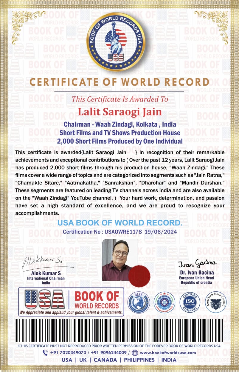 प्रसिद्ध फिल्म निर्माता वाह जिंदगी कोलकाता के ललित सरावगी ने देश विदेश के विभिन्न क्षेत्रों में फिल्म्स के निर्माण के लिए ऐतिहासिक विश्व रिकॉर्ड कायम कर सम्पूर्ण जैन समाज एवं भारत वर्ष का नाम रोशन किया है।कहते हैं कि अगर कुछ करने की तमन्ना हो तो उम्र तो एक आंकड़ा है, और ये साबित किया कोलकाता के 64 वर्षीय ललित सरावगी जैन ने,उन्होंने 64 साल की उम्र में 2 हजार शॉर्ट फिल्म्स बना कर विश्व रिकार्ड हासिल किया।