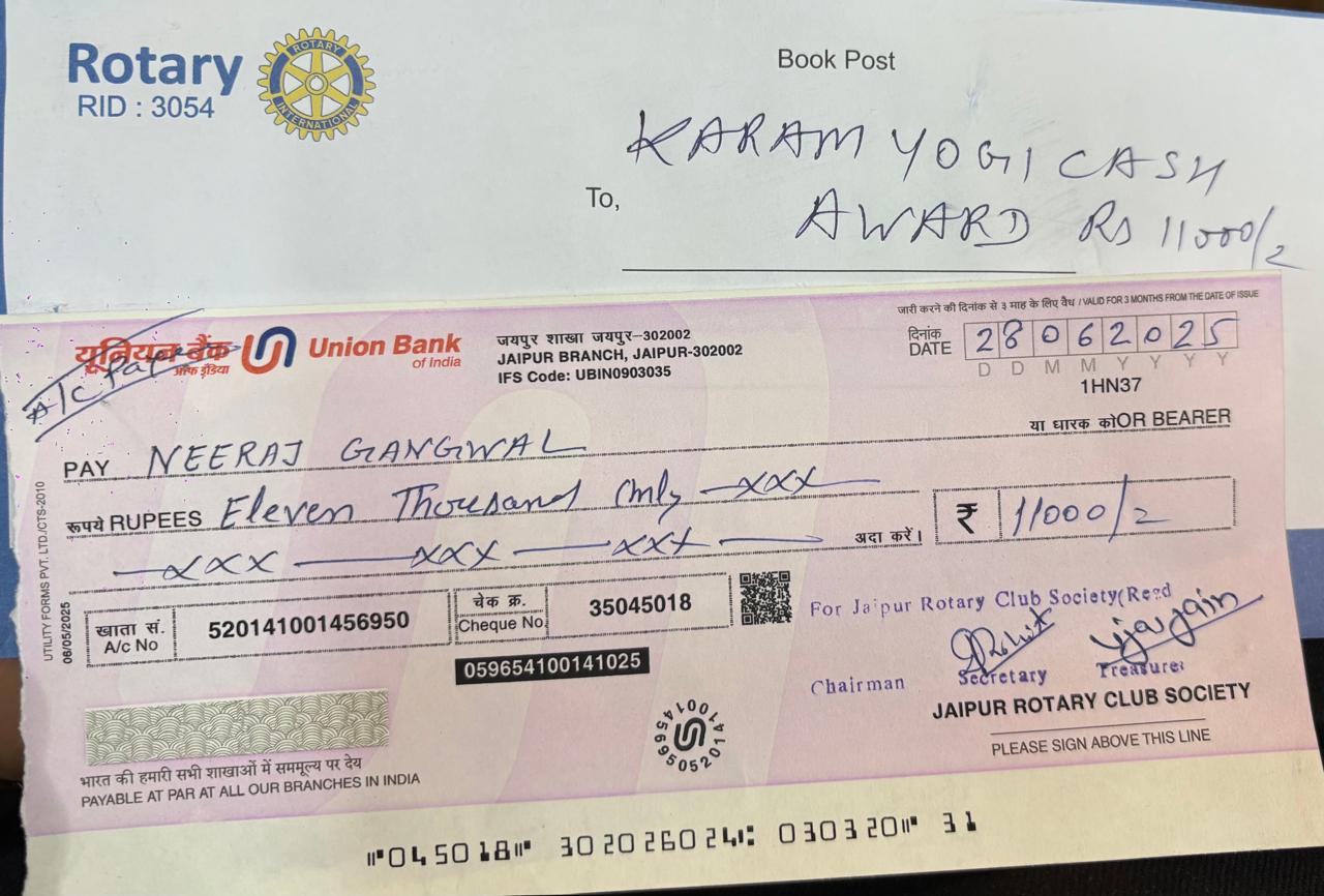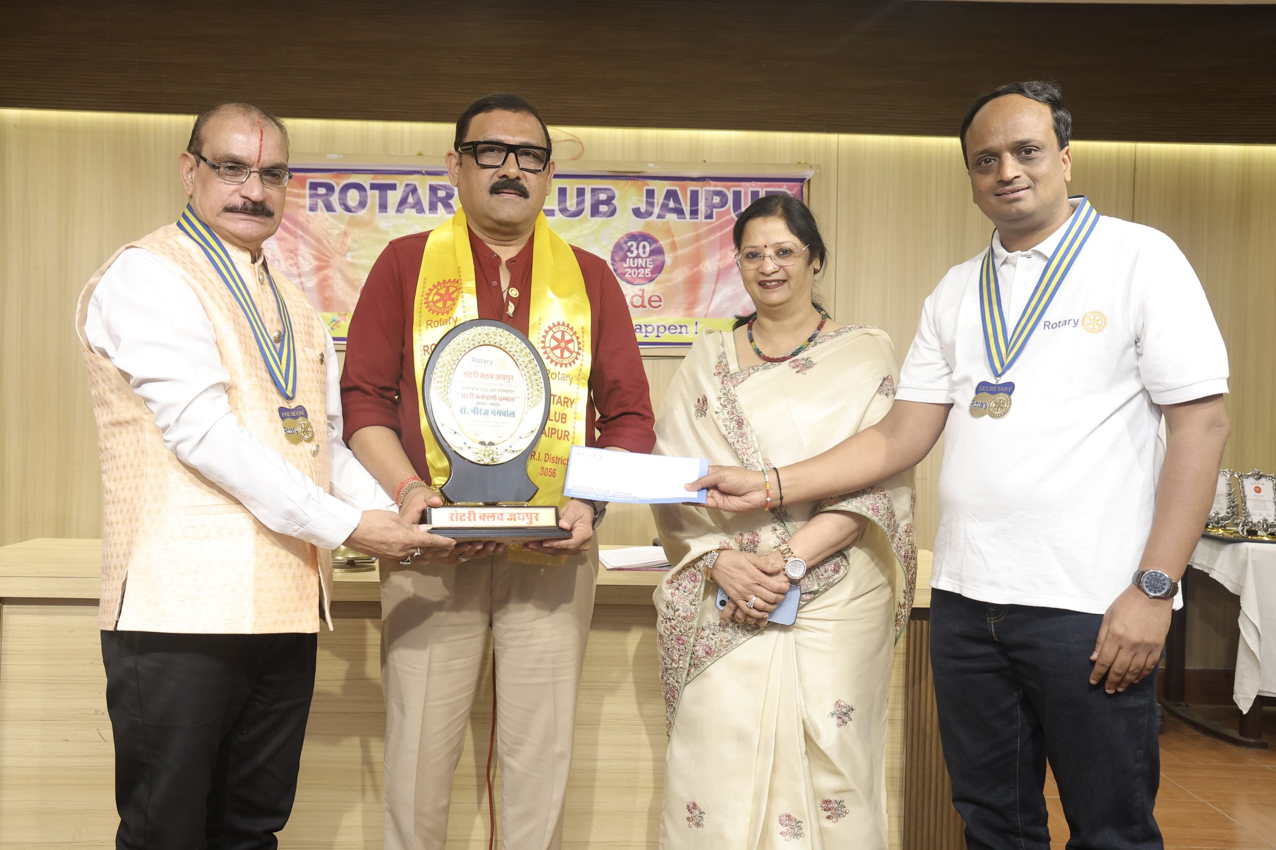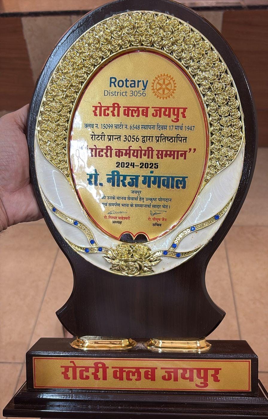 प्रसिद्ध समाज सेवी रोटरी क्लब जयपुर के वरिष्ठ सलाहकार रोटेरियन श्री नीरज गंगवाल की सेवाओं के देखते हुए सम्मानित किया गया कार्यक्रम में सिटीजन के चार्टर अध्यक्ष श्री सुधीर जैन ने बताया कि रोटरी डिस्ट्रिक्ट 3056 के सबसे प्रथम रोटरी क्लब जयपुर जिसकी स्थापना स्वतन्त्रता से पूर्व हुई थी उनके द्वारा उनके वार्षिक सम्मान समारोह में क्लब के वरिष्ठ सलाहकार रोटरीयन श्री नीरज गंगवाल को “रोटरी कर्मयोगी सम्मान 2024-25” और 11000 के नगद पुरस्कार से क्लब अध्यक्ष गिरधर महेश्वरी द्वारा सम्मानित किया गया। कार्यक्रम के दौरान सचिव पीयूष जैन, अशोक जैन, दिनेश जैन, सुनील जैन, उजास जैन, सुधीर गुप्ता, शिल्पा बैनदरें evam क्लब के गणमान्य सदस्य उपस्थित थे !