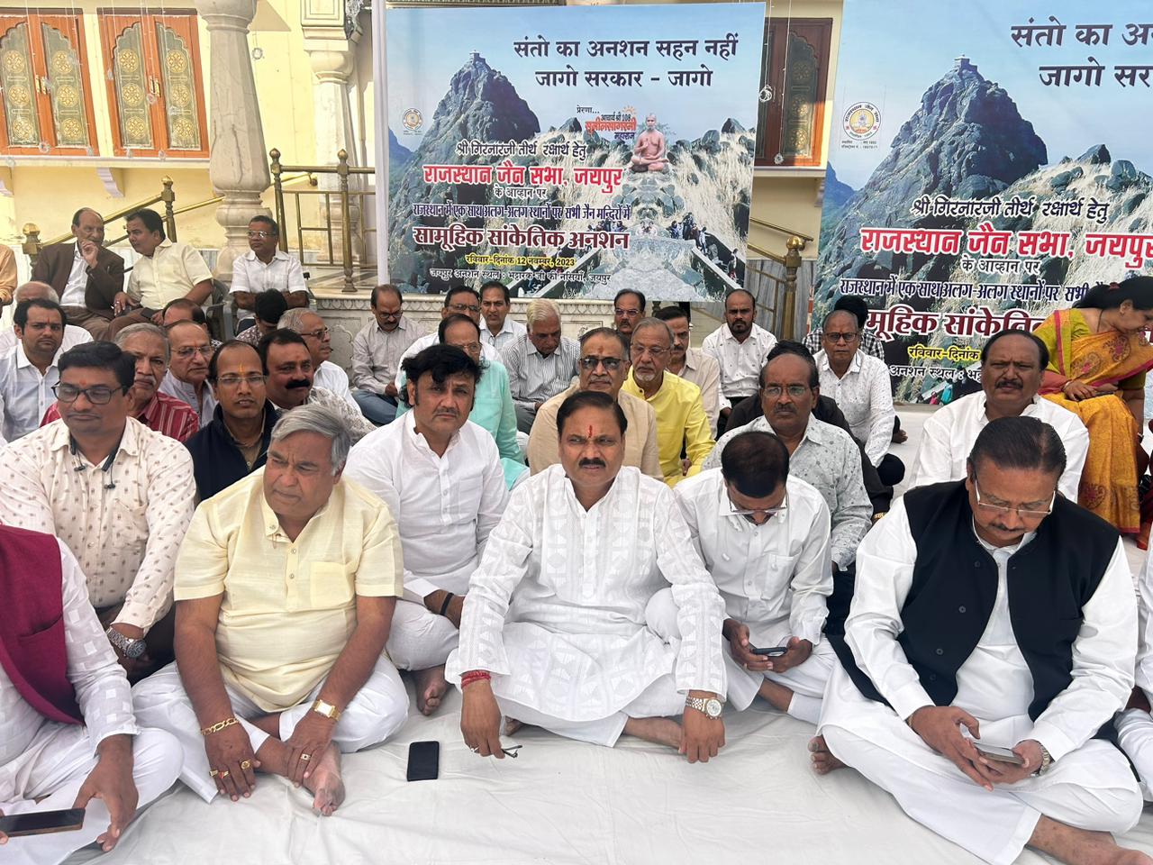 जयपुर – 14 नवम्बर – दीपों के त्यौहार दीपावली पर जैन संतों सहित सकल जैन समाज जैन धर्म के 22 वें तीर्थंकर भगवान नेमीनाथ की मोक्ष स्थली गिरनार तीर्थ की रक्षा हेतु भट्टारक जी की नसियां में जयपुर सहित देश के कई शहरों में सांकेतिक अनशन हुआ कार्यक्रम में राजस्थान में समाज की प्रादेशिक स्तर की एक मात्र पंजीकृत संस्था राजस्थान जैन सभा जयपुर के तत्वावधान में सम्पूर्ण प्रदेश में जिलों एवं तहसील स्तरों सहित गांवों में जैन मंदिरों पर तीन घंटे का सांकेतिक अनशन किया गया