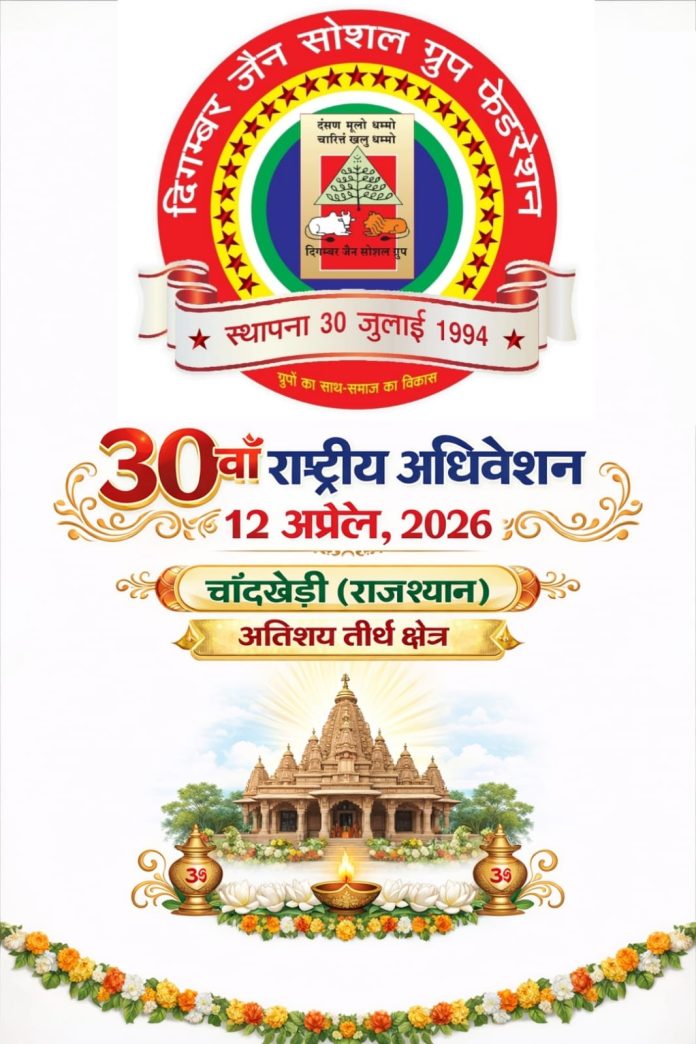 दिगम्बर जैन सोशल ग्रुप फेडरेशन द्वारा आयोजित 30वें राष्ट्रीय अधिवेशन (12 अप्रैल 2026, चांदखेड़ी) के सफल आयोजन हेतु राष्ट्रीय स्तर पर महत्वपूर्ण नियुक्तियाँ की गई है ।