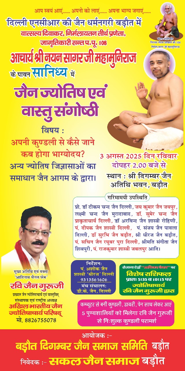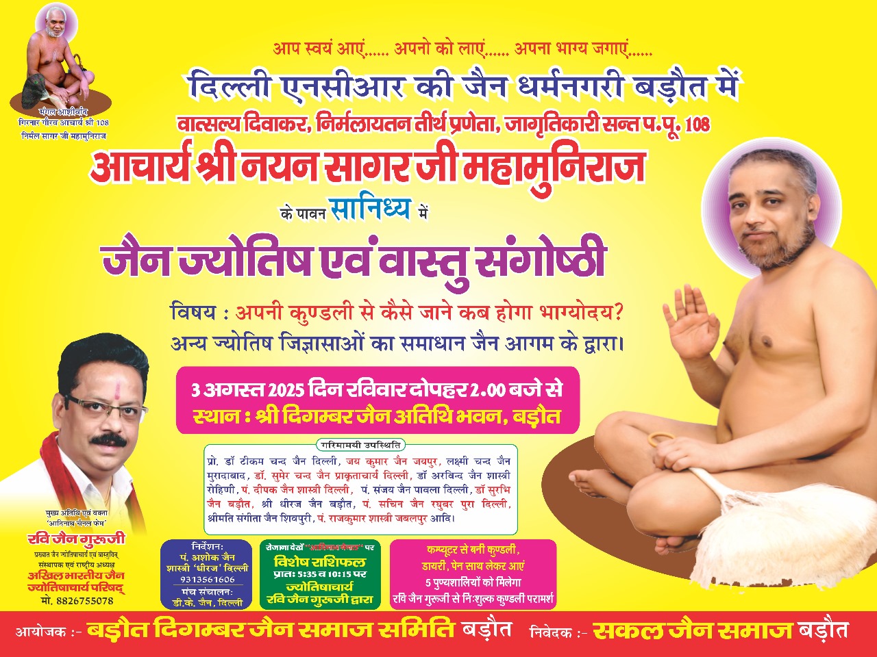 जागृतिकारी संत आचार्य श्री 108 नयन सागर जी महाराज के पावन सानिध्य में 3 अगस्त 2023 को बड़ौत में आयोजित होगा जैन ज्योतिष एवं वास्तु संगोष्ठी का भव्य कार्यक्रम, देश के विभिन्न हिस्सों से शामिल होंगे 20 से ज्यादा विद्वान
