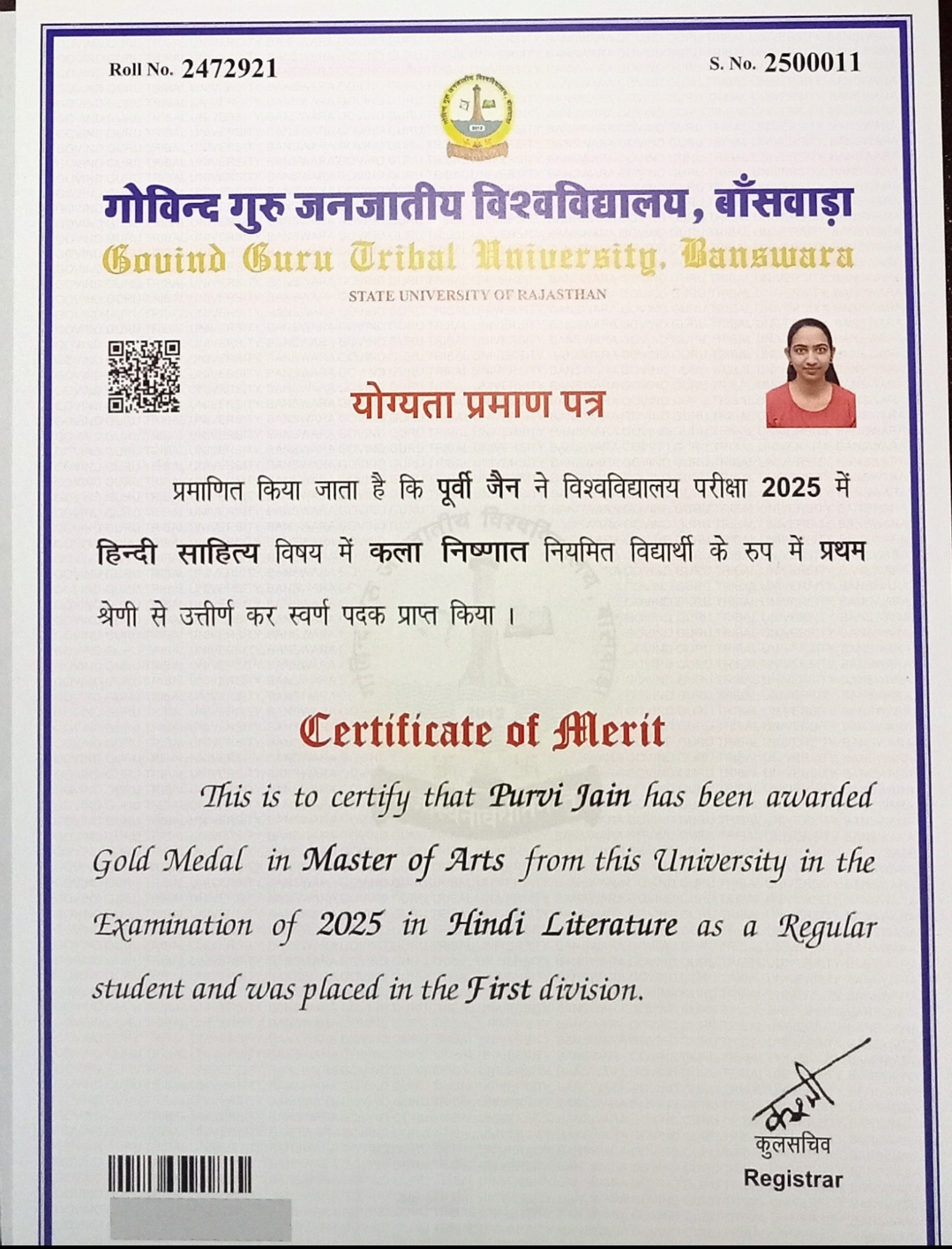 नौगामा की पूर्वी जैन को एम. ए. हिंदी साहित्य में स्वर्ण पदक, राज्यपाल ने किया सम्मानित