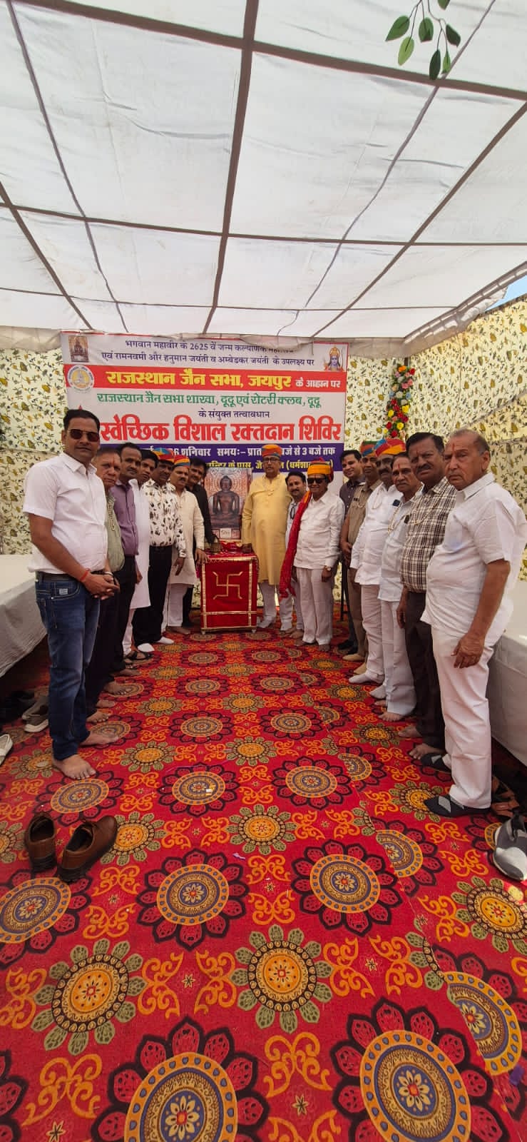 राजस्थान जैन सभा शाखा दूदू के तत्वाधान भगवान महावीर स्वामी के 2625वें जन्म कल्याणक महोत्सव के उपलक्ष्य में 14 मार्च शनिवार को दूदू में स्वैच्छिक विशाल रक्तदान शिविर आयोजित किया गया। कार्यक्रम में शाखा अध्यक्ष पदम अजमेरा ने बताया कि यह शिविर श्री आदिनाथ दिगम्बर जैन मंदिर के पास स्थित जैन भवन (धर्मशाला) में आयोजित हुआ, जहां युवाओं के साथ-साथ महिलाओं ने भी उत्साहपूर्वक रक्तदान कर मानव सेवा का संदेश दिया,शिविर में कुल 103 यूनिट रक्त संग्रहित किया गया। उक्त शिविर में महिलाओं की भागीदारी विशेष सराहनीय रही और कई महिलाओं ने स्वेच्छा से रक्तदान कर समाज में प्रेरणादायक उदाहरण प्रस्तुत किया।