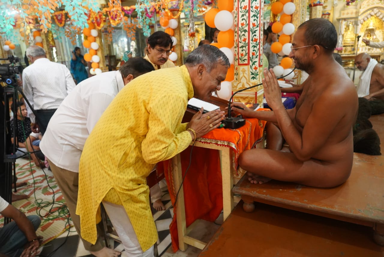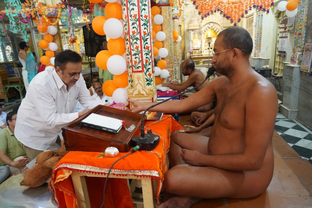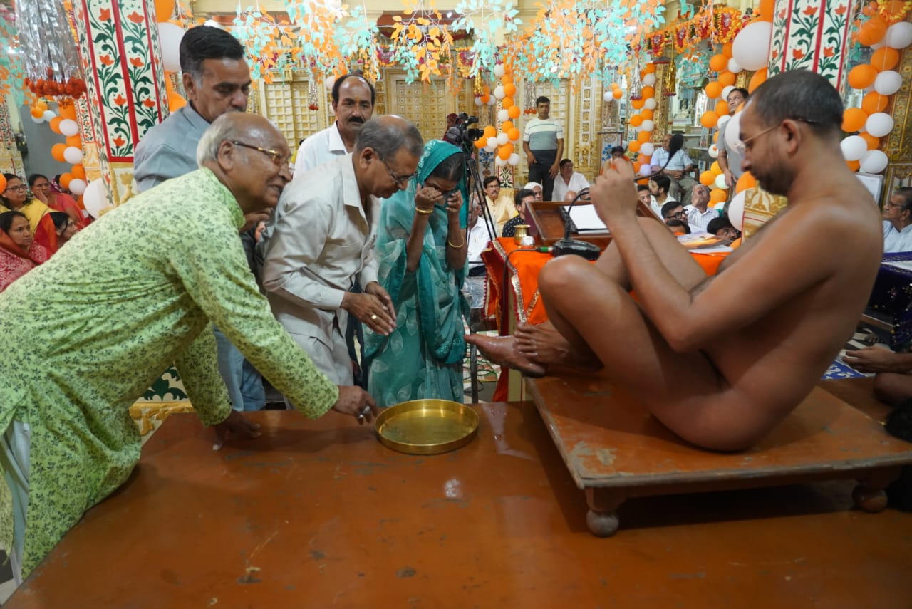 बड़ा मन्दिर में सर्वप्रथम मुनिश्री का पाद प्रक्षालन श्री कैलाश जी बाजटा परिवार एवं शास्त्र भेंट का सौभाग्य श्री निखिलेश सेठी परिवार को प्राप्त हुआ ।