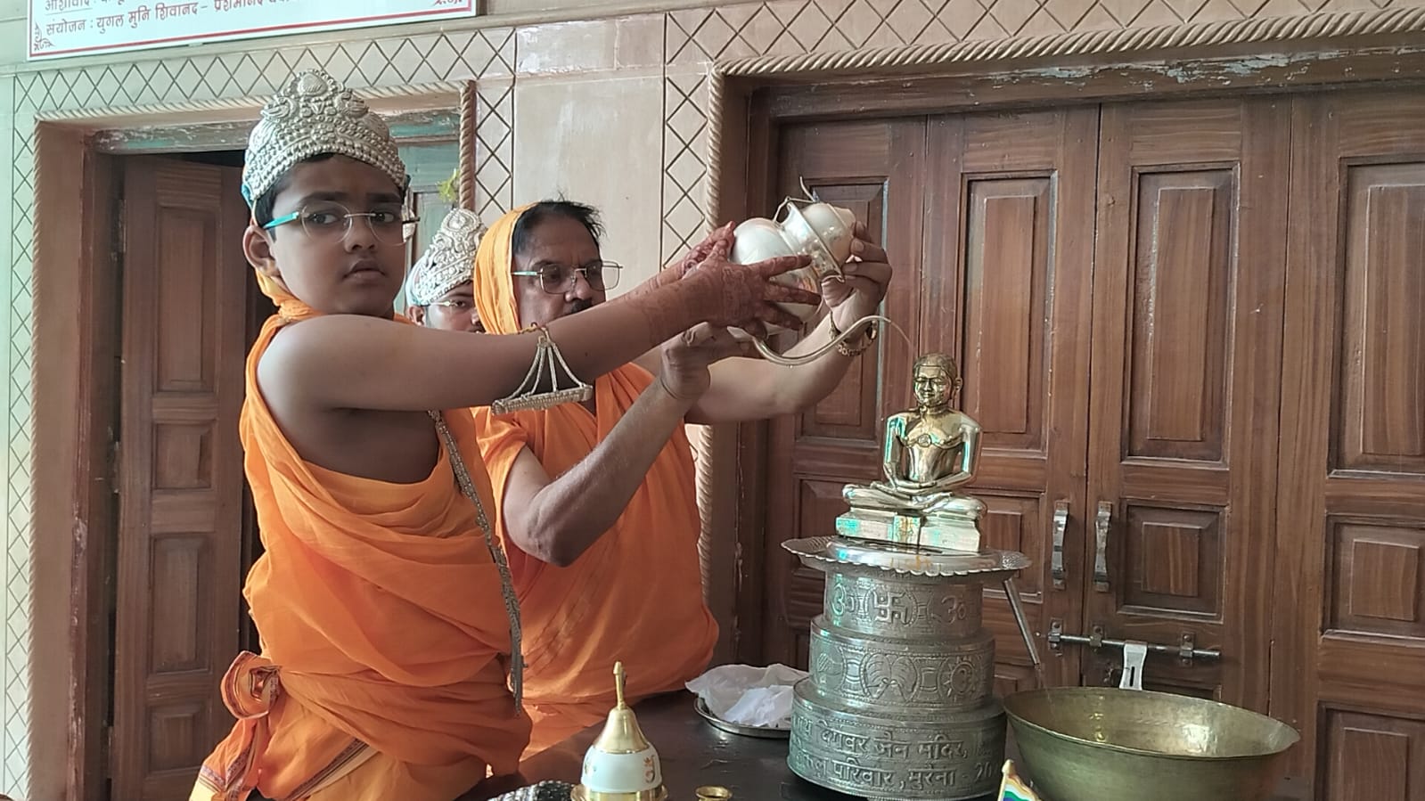 इसी संदर्भ में गढ़ी वाले नायक परिवार के शुभम जैन के सुपुत्र रेयांश जैन के आठ वर्ष पूर्ण होने पर गाजे बाजे के साथ श्री पार्श्वनाथ दिगम्बर जैन बड़ा मंदिर लाया गया । सर्व प्रथम बालक रेयांश जैन को पूजन के केशरिया धोती दुपट्टे पहनाए गए । सिर पर चांदी का मुकुट एवं हार आदि से सुसज्जित किया गया । विधानाचार्य पंडित चक्रेश जैन शास्त्री ने मंत्रोचारण के साथ रेयांश जैन से श्री जिनेन्द्र प्रभु के प्रथमबार अभिषेक की क्रिया सम्पन्न कराई । बालक के जन्म दिवस एवं आठ वर्ष पूर्ण होने पर श्री शांतिनाथ विधान का आयोजन किया गया । तत्पश्चात सभी के लिए वात्सल्य भोज की व्यवस्था की गई । इस अवसर बालक के समस्त परिजन, रिश्तेदार, इष्ट मित्र एवं सैकड़ों की संख्या में समाजजन मौजूद थे ।