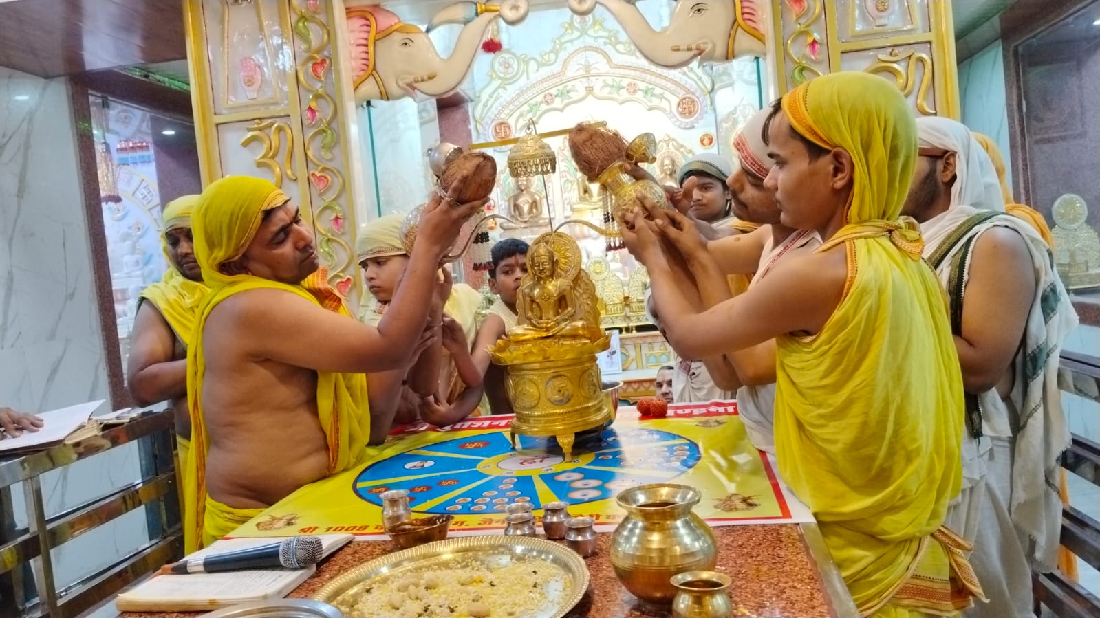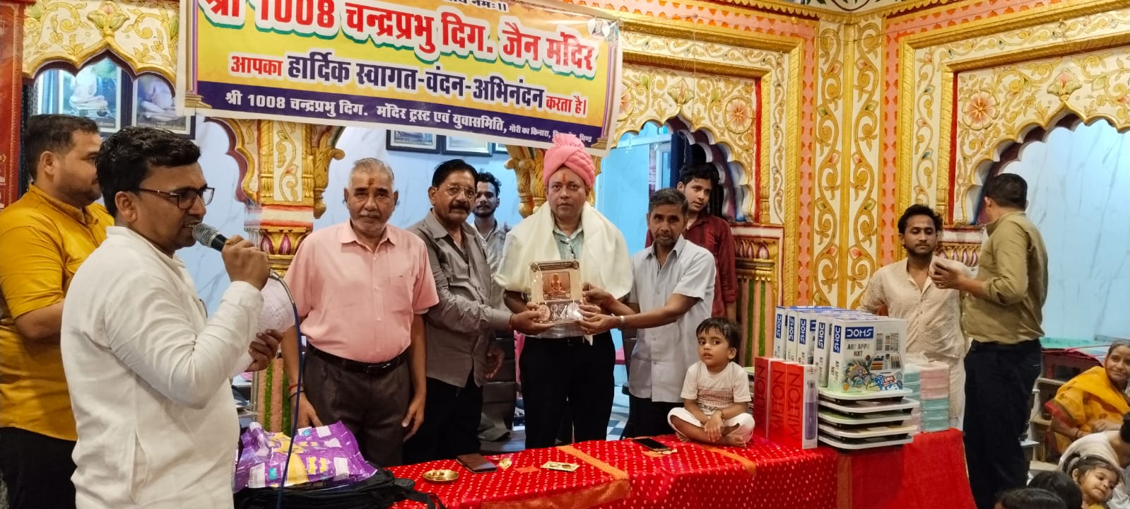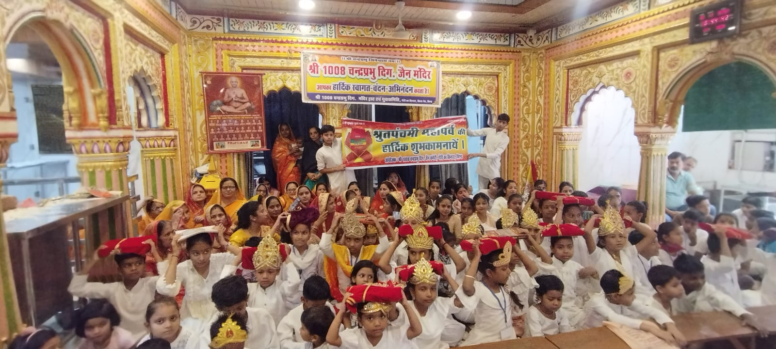 भिंड शहर मैं स्थित श्री 1008 चंद्रप्रभु दिगंबर जैन मंदिर गौरी किनारा किला गेट मैं चल रही विराग विशुद्ध संस्कार शिक्षण शिविर मैं दिनांक 11 जून को श्रुत पंचमी के पावन अवसर पर श्रुत ज्ञान वर्धन विधान आयोजन रखा गया ।जिसमे प्रातः 108 बच्चो के द्वारा भव्य जिनवाणी शोभा यात्रा निकाली गई। जिसमे चंद्रप्रभु भगवान का प्रथम अभिषेक करने का सौभाग्य यश जैन दीपू जैन मूल नायक भगवान का अभिषेक मोनू जैन सम्यक जैन को प्राप्त हुआ द्वादशांघ जिनवाणी के 12 कलशो अभिषेक किया गया, सुभाष जैन sbi, वंटी, शैलू जैन LIC , वैभव जैन, श्रेयांश जैन, सौरभ जैन, आशु, संभव, गौरव, शैलेंद्र, विकास जैन आलोक अभिषेक यश जैन एव शांतिधारा करने का सौभाग्य अशोक जैन लाला हलवाई रिंकी दीदी एव वैभव जैन यश जैन प्राप्त किया, जिनवाणी विराजमान करने का सौभाग्य ममता जैन प्रीति जैन ने प्राप्त किया 12 परिवारों के द्वारा भी जिनवाणी विराजमान की गई, विधान के बाद सभी के लिए भोजन कराया गया, शाम को महाआरती एवम शिविर का सम्मापन जिसमे मुख्य अतिथि संजय जैन (महिला बाल विकास अधिकारी) द्वारा आचार्य श्री 108 विराग सागर जी महाराज के चित्र अनावरण दीप प्रज्ज्वलित विनोद जैन, महेंद्र जैन, एव सभी अतिथियों का सम्मान युवा समिति के द्वारा किया गया। मंच संचालन शैलू जैन LIC के द्वारा किया गया कार्यक्रम का आयोजन श्री चंद्रप्रभु युवा समिति गौरी किनारा द्वारा सम्पन्न हुआ