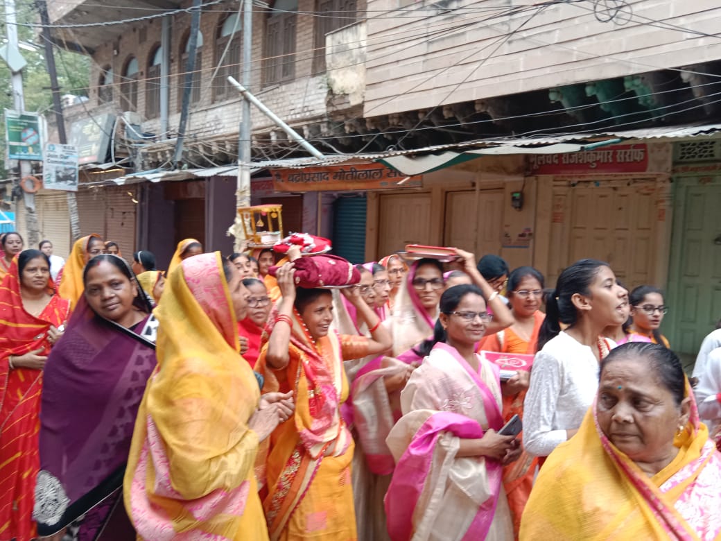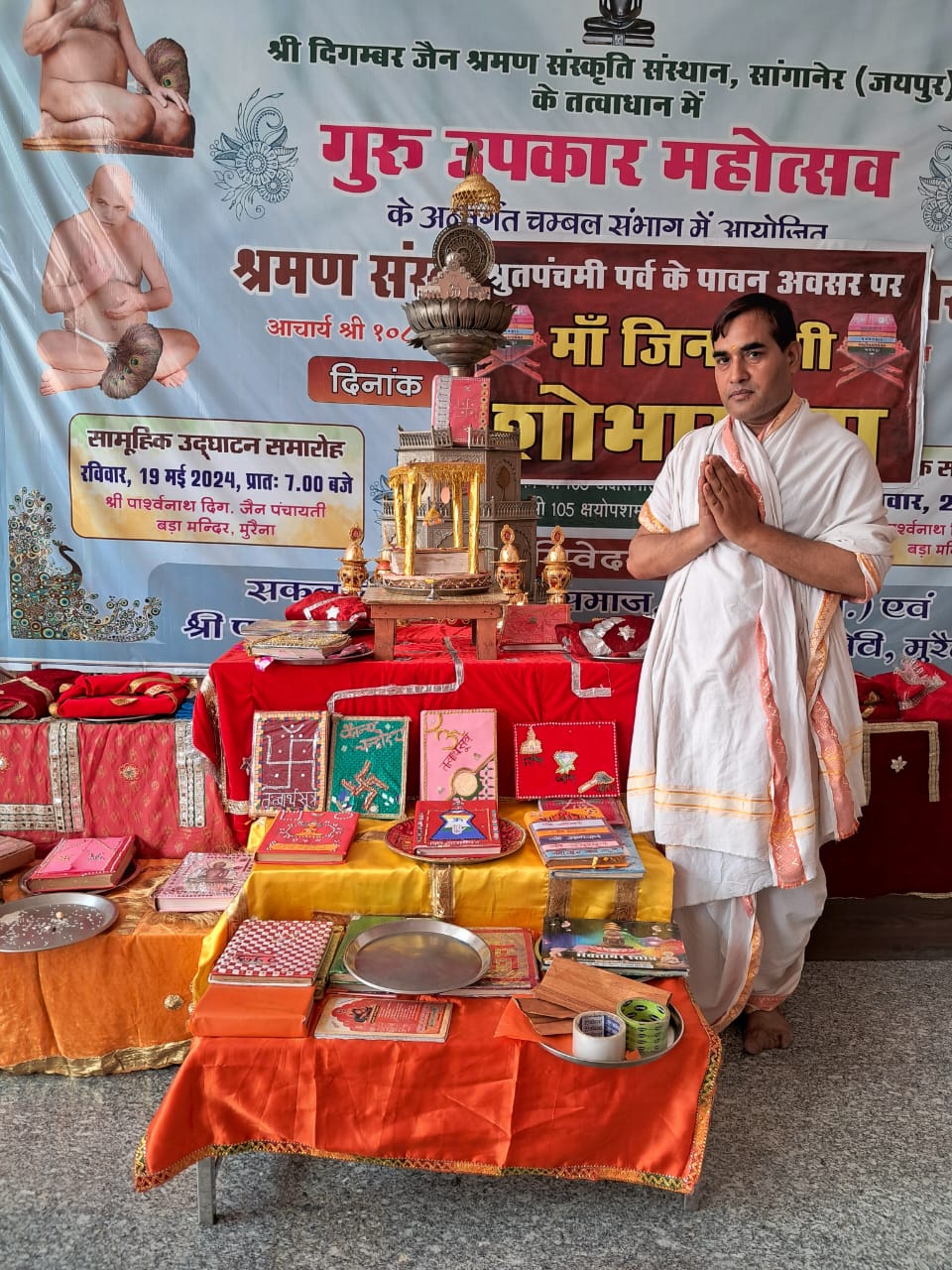 सर्वोदय पाठशाला द्वारा श्रुत पंचमी के पावन अवसर पर जिनवाणी मां की आराधना की गई । पूज्य क्षुल्लिका अक्षतमति माताजी एवम क्षुल्लिका क्षयोपसम माताजी के पावन सान्निध्य में मां जिनवाणी को चांदी की पालकी में विराजमान कर ढोल एवम तांसों के साथ भव्य शोभायात्रा निकाली गई । शोभायात्रा बड़े जैन मंदिर से प्रारंभ होकर गोपीनाथ की पुलिया, पीपल वाली माता, रुई की मंडी, सदर बाजार, लोहिया बाजार होती हुई जैन मंदिर पहुंची । शोभायात्रा में जैन बंधु, माताएं, बहिनें एवम बच्चे अपने अपने सिर पर जिनवाणी लेकर चल रहे थे । सभी लोग एक विशेष परिधान में दिखाई दे रहे थे । युवा साथी हाथों में पचरंगी ध्वजा लेकर चलायमान थे । सभी जन जिनेंद्र प्रभु एवम मां जिनवाणी की जय जयकार करते हुए जैन धर्म की प्रभावना कारक नारे लगा रहे थे । शोभा यात्रा के पश्चात मां जिनवाणी की पूजा अर्चना की गई एवम श्री जिनेंद्र प्रभु का अभिषेक एवम शांतिधारा की गई । इससे एक दिन पूर्व जिनवाणी सजाओं प्रतियोगिता रखी गई । जिसमें प्रथम, द्वितीय, तृतीय एवम सांत्वना पुरस्कार प्रदान किए जायेगें । इस अवसर मौजूद दोनों क्षुल्लिका माताजियों को शास्त्र भेंट किए गए । कार्यक्रम का निर्देशन पूर्व प्राचार्य महेंद्र कुमार शास्त्री, प्राचार्य चक्रेश शास्त्री एवम सफल संचालन विद्वत नवनीत जैन शास्त्री द्वारा किया गया ।