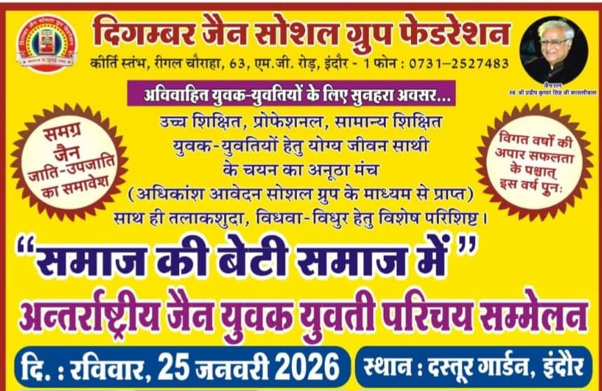 दिगम्बर जैन सोशल ग्रुप फेडरेशन द्वारा विगत दो वर्षों की भांति इस वर्ष भी “समाज की बेटी समाज में” थीम के अंतर्गत “अंतर्राष्ट्रीय जैन युवक-युवती परिचय सम्मेलन” का आयोजन किया जा रहा है। यह सम्मेलन रविवार, 25 जनवरी 2026 को दस्तूर गार्डन, इंदौर में आयोजित होगा।