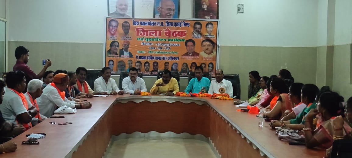 भिंड शहर के जैन महाविधालय के सभागार में आज वैश्य महासम्मेलन जिला इकाई की बैठक का सम्पन्न हुई इस बैठक में प्रदेश के संगठन महामंत्री मुख्य अतिथि सुधीर अग्रवाल विशिष्ट अतिथि राजकुमार गुप्ता (प्रिंस) प्रदेश संगठन महामंत्री ,सतीश अग्रवाल प्रदेश महामंत्री, प्रभारी दिनेश बंसल संभागीय अध्यक्ष मौजूद रहे , बैठक का आयोजन माँ सरस्वती जी की प्रतिमा पर माला पहनाते हुए किया गया कार्यक्रम की अध्यक्षता जिलाध्यक्ष ओम प्रकाश अग्रवाल बाबू जी के द्वारा की गई जिसमैं वैश्य महासम्मेलन जिला अध्यक्ष ओम प्रकाश अग्रवाल बाबूजी ने मुख्य अतिथियों का समिति के पद अधिकारियों से सम्मान स्वागत किया , कार्यक्रम में आज संगठन को मजबूत करने के लिए हर पद अधिकारी से परिचय ओर चर्चा की गई जिला अध्यक्ष अग्रवाल जी के द्वारा वैश्य महासम्मेलन इकाई जिला भिण्ड के सभी पदधिकारियों को संगठन के बारे में बताया गया संगठन को मजबूत कर आगे बढ़ाने के लिए सभी पदधिकारियों को जिम्मेदारी भी प्रदान की गई, महिला पदधिकारियों में महिला संभागीय अध्यक्ष गीता गुप्ता के द्वारा महिला पदधिकारियों का परिचय प्रदेश संगठन महामंत्री को कराया गया सभी कार्यकर्ताओं के परिचय के बाद प्रदेश संगठन महामंत्री सुधीर अग्रवाल के द्वारा सभी कार्यकर्ताओं को बताया गया की वैश्य महासम्मेलन इकाई में कितने आजीवन सदस्य है , ओर संगठन में जुड़े रहने पर आप सभी को संगठन की ओर से क्या फायदे होंगे , संगठन को आखिर क्यों बनाया गया है और इस संगठन को बनाने का उद्देश्य क्या था , इस विषय पर खास विस्तार से चरचा करते हुए प्रदेश के सभी जिले की विशाल टीम की कार्यशैली से भी परिचय कराया गया , प्रदेश संगठन महामंत्री के द्वारा सभी को कहा गया वैश्य महासम्मेलन इकाई में हम अपने समाज के ही लोगो को जोड़े ओर समाज को मजबूत बनाने के लिए एक दूसरे कि मिलकर मदद करे हमे हर ब्यक्ति के साथ सुख दुख में शामिल होना चाहिए ,जिससे हम समाज की हर परेसानी को समझ सकते है ,