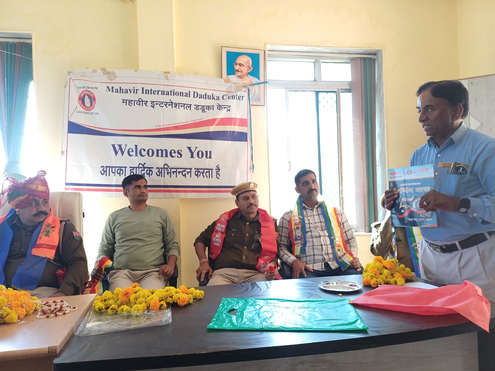 ग्राम पंचायत डडूका, सर्व समाज डडूका तथा महावीर इंटरनेशनल डडूका की ओर से गढ़ी पुलिस थाना के 7 पुलिस अधिकारियों का समर्पित एवं त्वरित सेवाओं के लिए बहुमान एवं अभिनन्दन किया गया। कार्यक्रम की अध्यक्षता पूर्व सरपंच एवं प्रशासिका रेखा महवाई ने की, मुख्य अतिथि थानाधिकारी गढ़ी तेजसिंह सांदु तथा विशिष्ट अतिथि मांगीलाल ए एस आई, शैलेन्द्र पाटीदार हेड कांस्टेबल, मदन सिंह आसूचना अधिकारी, अशोक पाटीदार बीट कांस्टेबल महेंद्र सिंह ड्राइवर एवं नरेश चंद्र कांस्टेबल थे। प्रारंभ में कार्यक्रम संचालक अजीत कोठिया ने सभी का परिचय देते हुए पुलिस थाना गढ़ी की टीम की सक्रिय, समर्पित, त्वरित सेवाओं की सराहना की। डडूका गांव में 4 दिसंबर को हुई चोरी की घटना के त्वरित समाधान मात्र 4दिन में करने की ग्रामीणों ने मुक्त कंठ से सराहना की। स्वागत उद्बोधन पूर्व सरपंच मणिलाल सूत्रधार ने दिया। विष्णु प्रसाद रावल, राजेश शाह, रीतेश शाह रणजीत सिंह सोलंकी, सुंदरलाल पटेल, गौरव रावल सुंदरलाल स्वर्णकार, सेवा दास वैष्णव सहित कई ग्रामीणों ने पुलिस अधिकारियों की निष्ठा और समर्पित सेवा की सराहना की। इस अवसर पर गढ़ी थानाधिकारी तेजसिंह सांदु का मणिलाल सूत्रधार, विष्णु प्रसाद रावल, सुंदरलाल पटेल, राजेश शाह, रणजीत सिंह सोलंकी, रेखा महवाई ने साफा बंधवाकर, माल्यार्पण कर तथा दुपट्टा औढ़ा कर सम्मान किया। सभी सहयोगी पुलिस विभाग के समर्पित साथियों मांगीलाल, शैलेन्द्र पाटीदार, मदन सिंह, अशोक पाटीदार, महेंद्र सिंह एवं नरेश चंद्र का ग्रामीणों ने माल्यार्पण ओर उपरणा औढ़ा कर भव्य सम्मान किया। अपने उद्बोधन में तेजसिंह सांदु ने ग्रामीणों से पुलिस प्रशासन को दिए गए सहयोग ओर सम्मान के लिए आभार व्यक्त करते हुए सभी दुपहिया वाहनधारियों से हेलमेट पहनने का आह्वान किया। अध्यक्षीय उद्बोधन में रेखा महवाई ने डडूका में पुलिस थाना गढ़ी द्वारा दिए गए सहयोग को उत्साहवर्धक बताया। इस अवसर पर जैन समाज डडूका की ओर से राजेश शाह, भरत जैन, राजेंद्र कोठिया, रीतेश शाह, अनिल कोठिया, सुधीर सेठ, केसरीमल भरड़ा, हितेश जैन, अशोक शाह, अजीत कोठिया, जयदीप शाह, दिनेश जे शाह, धनपाल शाह सहित सभी समाजजनों ने माल्यार्पण एवं पंच रंगी दुपट्टा औढ़ा कर सम्मान किया। महावीर इंटरनेशनल डडूका की ओर से सभी पुलिस अधिकारियों का समर्पित एवं त्वरित सेवाओं के लिए रणजीत सिंह सोलंकी, सुंदरलाल पटेल, विष्णुप्रसाद रावल, अजीत कोठिया, राजेंद्र कोठिया, हितेश जैन, मणिलाल सूत्रधार सहित कई सदस्यों ने अहिंसा दुपट्टा औढ़ा कर सम्मान किया। इस अवसर पर थानाधिकारी तेजसिंह सांदु ने महावीर इंटरनेशनल की मुख पत्रिका महावीर प्रवाह के स्वर्णजयंती अंक का लोकार्पण किया। जय हिंद के सैल्यूट भरे ग