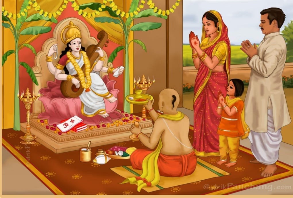 इस दिन हर घरों में केशरिया चावल बनाए जाते हैं और प्रातः स्नान के पश्चात पीले परिधान पहनना चाहिए फिर मां सरस्वती का पूजन करना चाहिए। कहते है कि प्रजापति ब्रह्मा जी ने विष्णु जी की आज्ञा से सृष्टि की रचना कर दी । पृथ्वी पर आकर देखा तो सन्नाटा, किसी के मुंह से शब्द नहीं निकले थे। तब इस उदासी को देखकर ब्रह्म जी ने अपने कमंडल से जल को छिड़का जल कणों से वृक्षों पर एक शक्ति हाथों में वीणा लिए, पुस्तक लिए माला पहने प्रकट हुई तब ब्रह्म जी ने उस देवी से वीणा बजाकर उदासी दूर करने कहा। तो सभी जीवो को बोलने की शक्ति मिली। उस देवी का नाम सरस्वती पड़ा। यह देवी विद्या, वृद्धि, ज्ञान, संगीत, कला, विज्ञान, शिल्प कला की देवी है।
