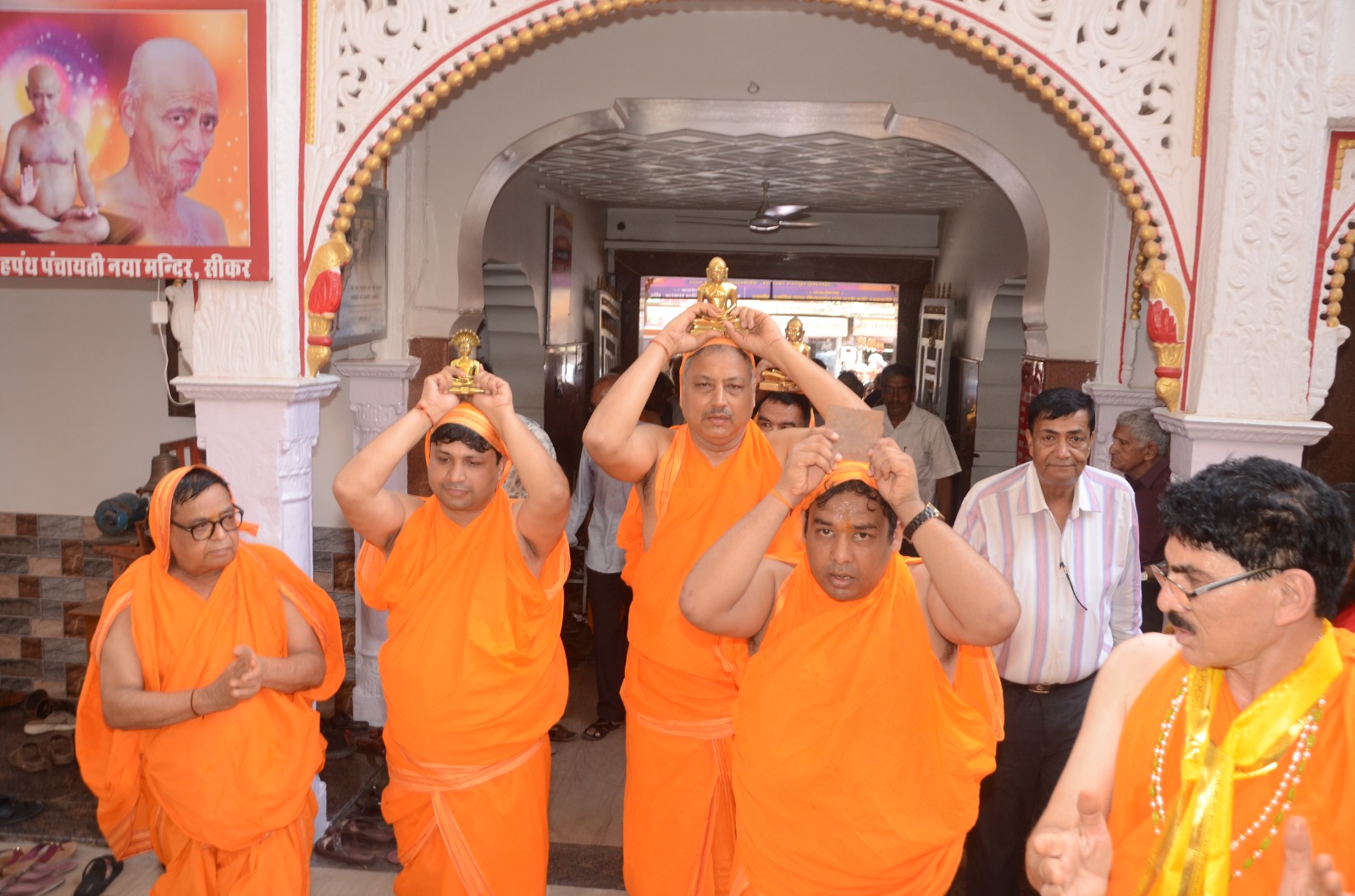 एवं जिनबिंब विराजमान महोत्सव आयोजन किया गया। इस दौरान 64 युगलों ने 64 मंडलीय श्री वर्धमान स्तोत्र महामण्डल विधान का आयोजन किया इसके बाद ध्वजारोहण कमल किशोर संगही परिवार ने किया गया। श्रीजी के जयकारे लगाए गए कार्यक्रम में जैन भवन से नया मंदिर तक भव्य जुलूस के साथ विधि-विधान से श्रीजी को मुख्य वेदी में विराजमान किया गया कार्यक्रम में समाज के प्रियंक गंगवाल ने बताया कि भगवान शांतिनाथ की मूर्ति विराजमानकर्ता पंडित फूलचंद शास्त्री परिवार सीकर दिल्ली एवं सुमतिनाथ भगवान मूर्ति विराजमानकर्ता स्वर्गीय मिश्रीलाल काला धोद इम्फाल बेंगलुरु थे, सौधर्म इन्द्र बने फतेहचंद काला परिवार धोद, कुबेर इंद्र कमल गंगवाल परिवार सुरेरा वाले, ईशान इंद्र पवन छाबड़ा परिवार पालवास वाले, सानत इंद्र भागचंद सेठी परिवार खुड़ वाले ,माहेन्द्र इंद्र प्रकाश चंद काला परिवार धोद वाले का सौभाग्य प्राप्त हुआ।मंदिर प्रबंध समिति के अध्यक्ष गोपाल काला मंत्री पवन छाबड़ा ने बताया कि मंगलाअष्टक,अभिषेक शांतिधारा के बाद सभी मांगलिक क्रियाएं हुई इस दौरान शांतिनाथ जी के सिंहासन मदन लाल पहाड़िया परिवार मांडोता वाले एवं छत्र मदन लाल छाबड़ा परिवार पालवास वाले,भामंडल राजकुमार संगही परिवार को सौभाग्य मिला और सुमतिनाथ जी का सिंहासन मनोज बज परिवार पलाड़ा वाले छत्र मुकेश कुमार लुहाड़िया परिवार सुरेरा वाले भामंडल विमला देवी रतन पाटनी परिवार धोद वाले सीकर निवासी सूरत प्रवासी को सौभाग्य मिला श्री जी की शांति धारा फतेह चन्द काला,चिरंजी लाल काला और स्व. फूलचंद शास्त्री परिवार को मिला कार्यक्रम के दौरान वात्सल्य भोजन विमल कुमार झाँझरी (रेटा वाले) कमला देवी धर्मपत्नी श्रीमान स्वर्गीय राजकुमार मानजीका सीकर-सूर भागचंद नरेश कुमार कालीका परिवार पंडित फूलचंद शास्त्री परिवार परिवार सीकर-दिल्ली बुद्धि प्रकाश डॉ अंकुर ठोलिया मंडा वाले सीकर को प्राप्त हुआ श्री दिगम्बर जैन तेरहपंथ पंचायती नया मन्दिर के सभी सदस्य गोपाल काला पवन छाबड़ा विनोद संगही तेजकरण पिराका मुकेश लुहाड़िया अंकित मानजीका प्रियंक गंगवाल ने लाभार्थी परिवारों का स्वागत सम्मान किया सांसारिक विषमताओं में लिप्त प्राणी मात्र के कल्याणार्थ मानव जीवन के हितार्थ तथा आत्मिक शान्ति की प्राप्ति दिगम्बर जैन नया मन्दिर में चौसठ ऋद्धि संपन्न 64 मंडलीय श्री वर्धमान स्तोत्र महामण्डल विधान एवं जिनबिंब विराजमान महोत्सव मुनि प्रणम्यसागर महाराज के मंगल आर्शीवाद से पंडित श्री शुभम जैन ‘‘शुभांश’’ बड़ा मलहरा वालों के द्वारा विधि विधान और अंशुल जैन एंड पार्टी सागर के गीत संगीत द्वारा वीतरागी जिनबिम्बों को विराजमान किया गया कार्यक्रम में सकल दिगंबर जैन समाज 