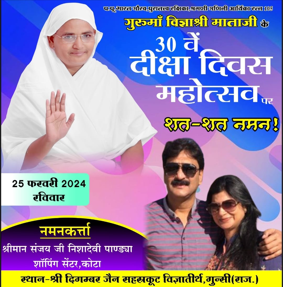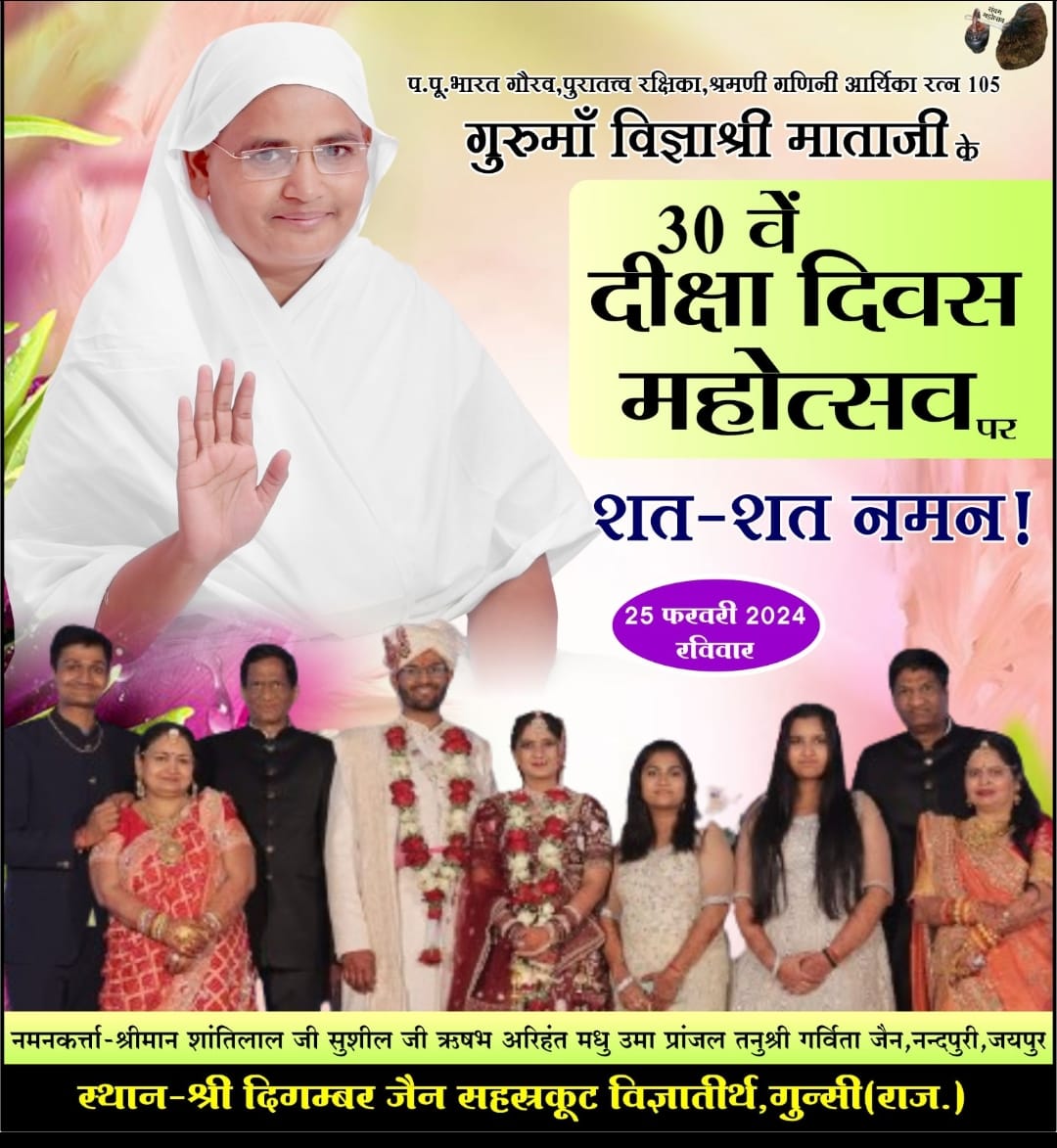 श्री दिगम्बर जैन सहस्रकूट विज्ञातीर्थ, गुन्सी (राज.) की पावन धरा पर विराजमान श्रमणी गणिनी आर्यिका रत्न विज्ञाश्री माताजी ससंघ सान्निध्य में श्री सुपार्श्वनाथ भगवान का ज्ञान कल्याणक महोत्सव हर्षोल्लास पूर्वक मनाया गया। माताजी के मुखारविंद से भगवान की स्तुति आराधना की गई। तत्पश्चात् श्री शांतिनाथ चैत्यालय में आज की शांतिधारा करने का सौभाग्य अनिल शाह मोहनबाड़ी, जयपुर , प्रहलाद जैन झिलाई एवं महावीर प्रसाद पहाड़िया झिलाई वालों ने प्राप्त किया। तत्पश्चात गुरुमाँ की उपवास के उपरांत पारणा निर्विघ्न सम्पन्न कराने का सौभाग्य प्रकाश छाबडा जयपुर, सुमित्रा छाबडा जयपुर, शांतिलाल अजमेरा जयपुर, अनिल शाह जयपुर, मंजू देवी शाह जयपुर, शिमला जैन निवाई, महेश मोटूका वाले निवाई वालों ने प्राप्त किया।
