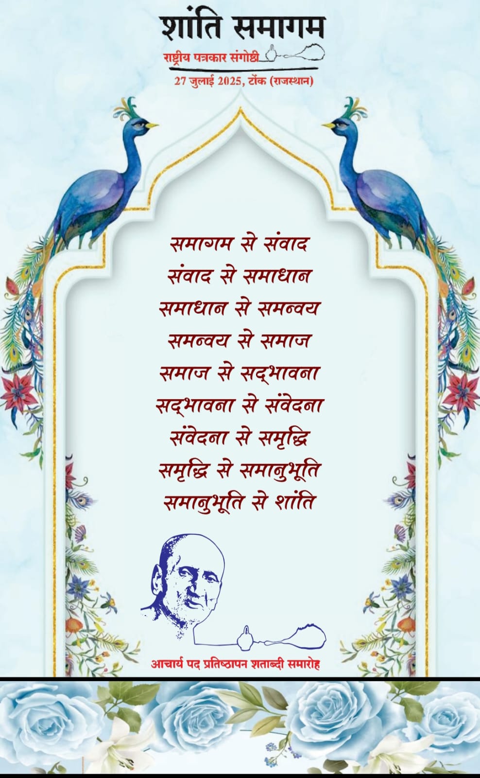 आचार्य पद प्रतिष्ठापना शताब्दी महोत्सव के अंतर्गत 2024+ 2025 में अनेक आयोजन आयोजित किए जा रहे हैं! आचार्य श्री वर्धमान सागर जी महाराज का 57 वां पावन चातुर्मास राजस्थान के धर्म प्रिय गुरु भक्त नगर टोंक में संपन्न हो रहा है विशेष आयोजनों की श्रृंखला में शांति समागम राष्ट्रीय पत्रकार संगोष्ठी का आयोजन रविवार 27 जुलाई 2025 को श्री दिगंबर जैन नसिया टोंक (राजस्थान ) में किया जा रहा है संगोष्ठी संयोजक श्री राजेंद्र जैन महावीर ने बताया कि आचार्य श्री शांति सागर जी महाराज के व्यक्तित्व कृतित्व के साथ सामाजिक संदर्भ में देश के पत्रकारों, संपादकों के लिए आचार्य वर्धमान सागर जी ससंघ व प्रमुख चिंतक विचारक- संपादक- पत्रकारों का मार्गदर्शन प्राप्त होगा!