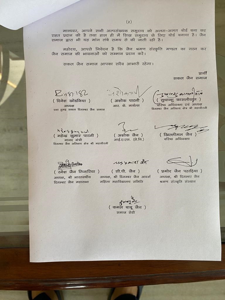 श्री दिगम्बर जैन आदर्श महिला महाविद्यालय समिति के अध्यक्ष चन्द्र प्रकाश जैन तथा श्री दिगम्बर जैन श्रमण संस्कृति संस्थान के अध्यक्ष प्रमोद पहाड़िया ने मुख्यमंत्री से आग्रह किया कि प्रदेश में श्रमण संस्कृति बोर्ड के गठन से ना केवल देश में बल्कि समूचे विश्व में सुख शान्ति,अहिंसा का वातावरण बनेगा l इससे पं.जवाहरलाल नेहरू के पंचशील के सिद्धान्त वृद्धिगत होगे l से.नि. आई.ए.एस.अशोक जैन एवं समाज सेवी कमल बाबू जैन ने बताया कि वर्तमान समय प्रदेश में बड़ी संख्या में अल्पसंख्यक वर्ग का जैन समुदाय निवास करता है इसके बावजूद भी जैन संस्कृति और जैन संस्थाओं का संचालन स्वतंत्र रूप से नही हो पा रहा है समय-समय पर अनेक विरोधी तत्व एवं संगठन जैन समुदाय के सदस्यो,जैन साधु संतो एवं संस्थाओं के विरुद्ध बयानबाजी और हमला करते रहते है l