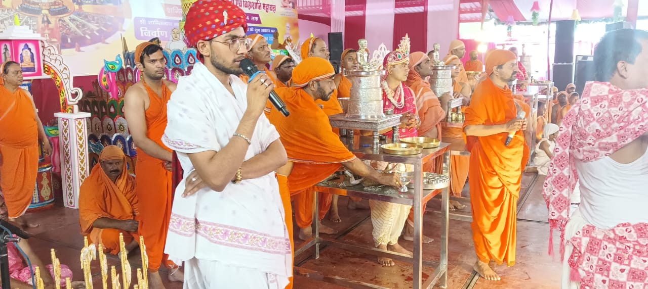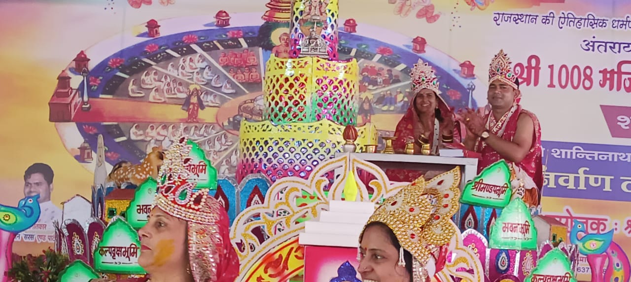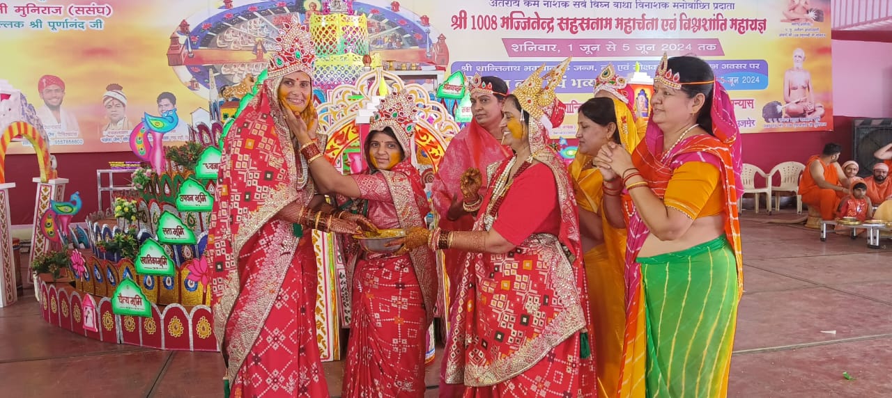 आज दिनांक 01 जून 2024 – मूलनायक 16 वें तीर्थंकर प्रभु श्री 1008 शांतिनाथ स्वामी के जन्म तप व मोक्ष कल्याणक के पावन अवसर पर श्री 1008 जिनसहस्रनाम महामंडल विधान महोत्सव आज भव्य घटयात्रा से ध्वजारोहरण एवं सकलीकरण एवं मण्डल शुद्धि से पूर्ण भक्तिभाव से श्री जिनशासन तीर्थक्षेत्र नाकामदार अजमेर में परम पूज्य आचार्य श्री 108 वसुनंदीजी महाराज के सुयोग्य शिष्य परम पूज्य उपाध्याय श्री 108 वृषभानंद जी मुनिराज, पूज्य मुनि श्री सदानंद जी मुनिराज एवं क्षुल्लक श्री पूर्णानंद जी महाराज के पावन सानिध्य में प्रारम्भ हुआ जिसमें समवषरण में बैठक भरत चक्रवर्ती के द्वारा पूजा अर्चना की गई। भव्य समोषरण सजाया गया।