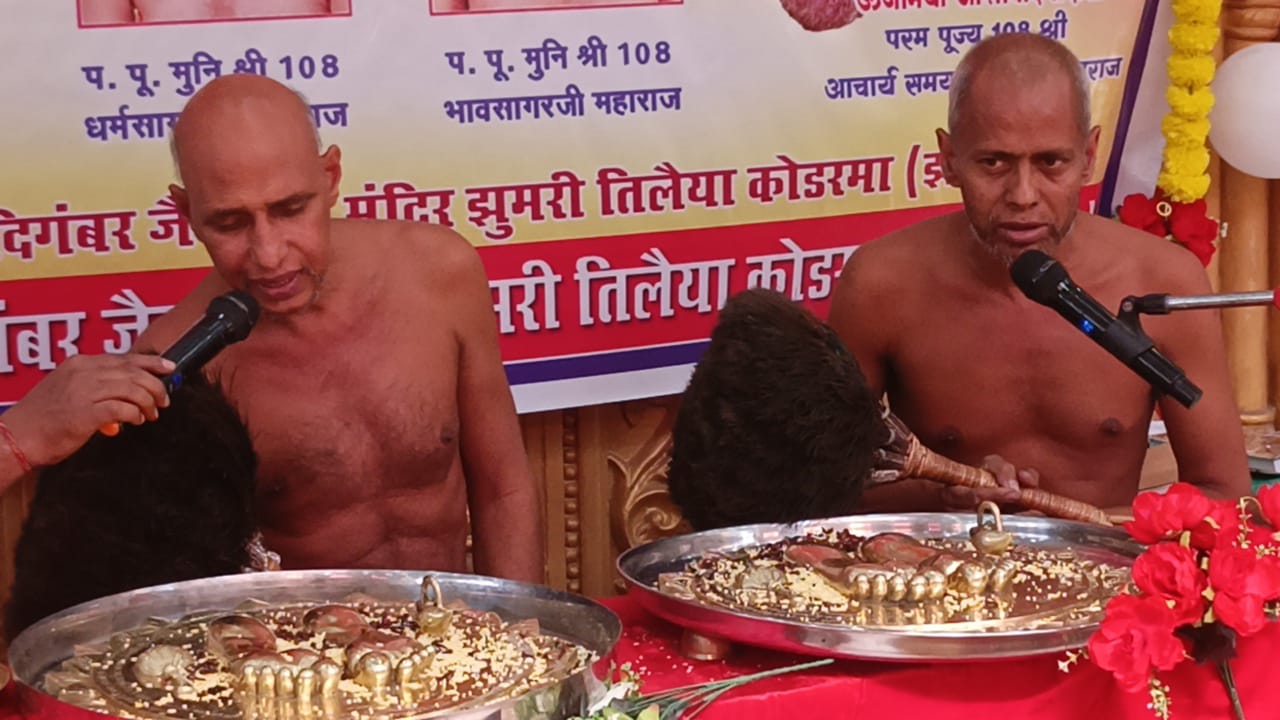 झुमरीतिलैया-आज प्रातः श्री दिगम्बर जैन समाज के सानिध्य में जैन मंदिर में 1008 श्री शांतिनाथ भगवान का महमस्तिकाभिषेक ओर विशेष गुरु मुख से शांतिधारा कराया गया ।इसके बाद कार्यक्रम प्रारम्भ किया गया जिसमें सर्व प्रथम सौधर्म इंद्र प्रदीप -मीरा जैन छाबड़ा के द्वारा ध्वजारोहण किया गया इसके पश्चात मुनि श्री108 भाव सागर जी मुनीराज को कमंडल अर्पण करने का सौभाग्य प्रदीप -मीरा जैन छाबड़ा,संजय-बबिता जैन गंगवाल के परिवार को प्राप्त हुआ।इसके पश्चात समाधिस्थ जैन संत परम पूज्य आचार्य श्री 108 ज्ञान सागर जी मुनीराज ओर उनके परमप्रभावक शिष्य समाधिस्थ जैन संत हर दिल मे बसने वाले परमपूज्य प्रातः स्मरणीय आचार्य श्री 108 विद्यासागर जी महामुनिराज के चरण चिंह का प्राण प्रतिष्ठा नगर में प्रथम बार मुनि दय के द्वारा 84 मंत्रो के साथ पूजा पाठ आदि जाप के साथ किया गया,ओर अष्ठ कुमारी के द्वारा भी पूजन किया गया। ये चरण चिन्ह पाटनी परिवार आर. के.मार्बल किशनगढ़ (राजस्थान) के द्वारा दिया गया जो देवघर जैन मंदिर में स्थापित होंगे।