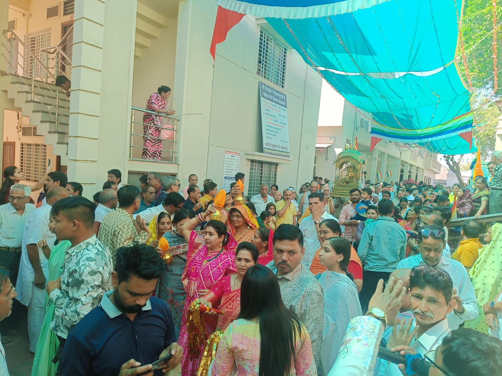 शोभायात्रा में स्वर्ण एवं रजत कलशों को सिर पर धारण किए पुण्यार्जक परिवार अग्रभाग में चल रहे थे। ढोल-ताशों, मंगल वाद्यों एवं भक्ति गीतों की मधुर स्वर लहरियों पर श्रद्धालु नृत्य करते हुए आगे बढ़ रहे थे। मार्ग में विभिन्न स्थानों पर पुष्पवर्षा कर शोभायात्रा का स्वागत किया गया। महिलाएं पारंपरिक वेशभूषा में कलश लिए चल रही थीं, वहीं युवा वर्ग ध्वज-पताकाएं लेकर धर्मध्वजा लहरा रहा था।