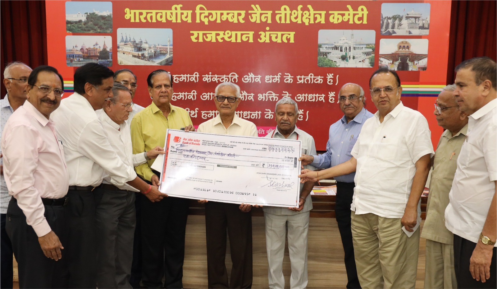 श्री महावीर जी अतिशय क्षेत्र प्रबंध कार्यकारिणी समिति ने शाश्वत तीर्थ श्री सम्मेद शिखर जी के संरक्षण एवं संवर्धन हेतु भारतवर्षीय दिगम्बर जैन तीर्थक्षेत्र कमेटी को एक करोड़ का चेक भेंट किया कार्यक्रम में दिगम्बर जैन अतिशय क्षेत्र के अध्यक्ष सुधांशु कासलीवाल ने बताया की भारतवर्षीय दिगम्बर जैन तीर्थ क्षेत्र कमेटी मुंबई के राष्ट्रीय अध्यक्ष श्री जम्बूप्रसाद जैन का जयपुर अधिकारिक यात्रा के दौरान आज अंचल अध्यक्ष राजकुमार कोठ्यारी की अध्यक्षता में भट्टारक जी की नसियाँ में आयोजित ऐतिहासिक समारोह में समाज के समक्ष जैन धर्म के शाश्वत तीर्थ श्री सम्मेद शिखरजी के संरक्षण एवं संबर्द्धन हेतु एक करोड़ रु का राशि का चैक दिगम्बर जैन अतिशय क्षेत्र श्री महावीरजी प्रबन्ध समिति की ओर से अध्यक्ष सुधान्शु कासलीवाल, संयुक्त मंत्री उमरावमल संघी, पी. के. जैन, कोषाध्यक्ष विवेक काला, कार्यकारिणी सदस्य सुरेश सबलावत, हेमन्त सौगानी ने तीर्थक्षेत्र कमेटी को भेंट किया, इस अवसर पर संस्था के 125 वर्ष के प्रवेश पर जनहितार्थ कार्यों के फोल्डर एवं लोगो का जवाहर लाल जैन द्वारा विमोचन किया गया। इसी क्रम में श्री शान्तिनाथ दिगम्बर जैन मन्दिर लाल कोठी की ओर से ढाई लाख और प्रसिद्ध रत्न व्यवसायी विवेक काला परिवार की ओर से पाँच लाख रु. की राशि का भी सहयोग दिया गया। इस अवसर पर अंचल के परम शिरोमणि संरक्षक सुधान्शु कासलीवाल ने सभी आगंतुको को सम्बोधित करते हुए कहा कि तीर्थक्षेत्रों की सुरक्षा व संरक्षण की जिम्मेदारी सभी की सामूहिक है।इस अवसर पर अंचल के परम शिरोमणि संरक्षक विवेक काला ने कहा कि संस्थाएं तभी अपनी गतिविधियों को सफलतापूर्वक संचालित कर सकती हैं, जब समाज का तन-मन धन से सक्रिय सहयोग होता रहे।इस अवसर पर अंचल के परम शिरोमणि संरक्षक सुरेश सबलावत ने कहा कि श्री शिखरजी तीर्थ स्थल जैन समाज के अतीत का सौरभ, वर्तमान का गौरव और भविष्य का संबल है, प्रत्येक व्यक्ति को इसके संरक्षण का संकल्प लेना चाहिए समारोह का प्रारम्भ णमोकार मंत्र के उच्चारण से सुदीप बगड़ा ने किया। तप्पश्चात् राष्ट्रीय अध्यक्ष का 11 फीट की फूलो की माला पहनाकर अभिनन्दन रुप में शाल, साफा, दुपट्टा एवं प्रशस्ति पत्र देकर स्वागत किया गया, कार्यक्रम में अंचल के यशस्वी अध्यक्ष राजकुमार कोठ्यारी ने स्वागत भाषण दिया और कहा कि तीर्थों की रक्षार्थ हमे सदैव तैयार रहना चाहिए, उन्होंने आगे कहा कि तीर्थ हमारी परम्परा के प्रतीक हैं, आने वाली पीढ़ियों के लिए उन्हें सुरक्षित रखना हमारा दायित्व है।राष्ट्रीय मंत्री एवं तीर्थ रक्षार्थ दान पत्र गुल्लक योजना के राष्ट्रीय संयोजक इन्दौर निवासी हँसमुख जैन गाँधी ने गुल्लक योजना की बात रखी और सदन में उपस