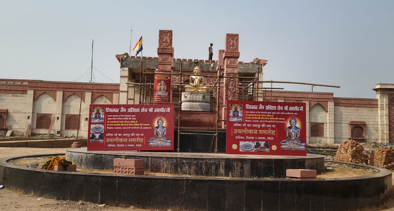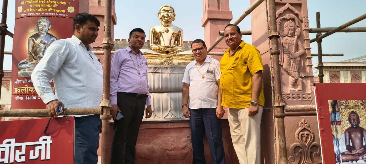 भारत सरकार और रेल मंत्रालय की अमृत भारत स्टेशन स्कीम के तहत श्री महावीर जी रेलवे स्टेशन प्रांगण में बन रहे गोल सर्कल के अंदर बंसी पहाड़ पुर के पत्थरों से बन रही है कलात्मक छतरी के अंदर कमल आसन पर ब्रोंज मैटल की बनी साढे तीन फीट ऊंची भगवान महावीर स्वामी की मनोहारी प्रतिमा को सस्मान विराजमान किया गया। धर्म समाज प्रचारक राजेश जैन दद्दू ने बताया कि