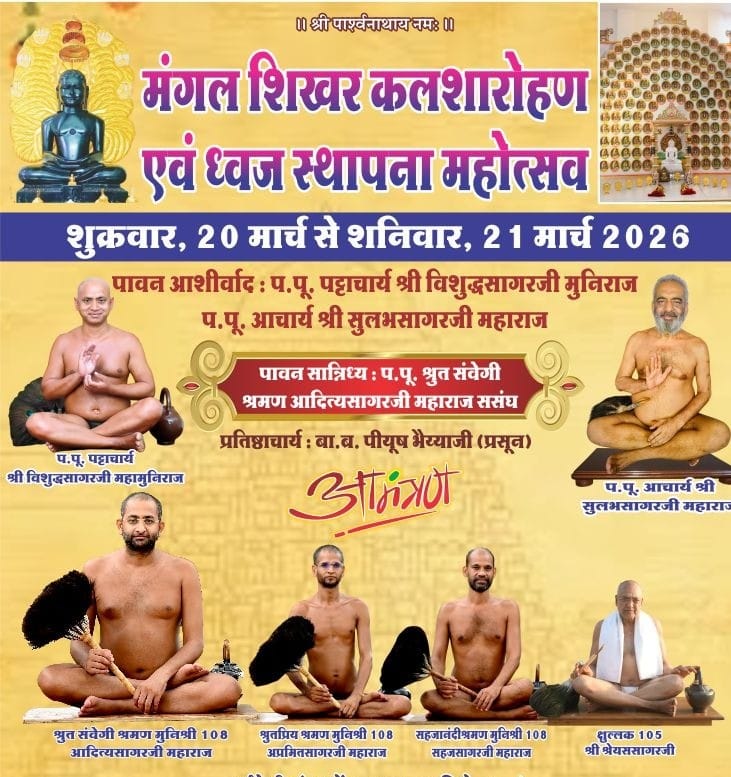 इंदौर, श्री पार्श्वनाथ दिगंबर जैन मंदिर, विद्या पैलेस में 20 मार्च से 21 मार्च 2026 तक भव्य मंगल शिखर कलशारोहण एवं ध्वज स्थापना महोत्सव का आयोजन किया जा रहा है। धर्म समाज प्रचारक राजेश जैन दद्दू ने बताया कि श्रंमण संस्कृति के महामहिम पट्टाचार्य आचार्य श्री विशुद्ध सागर जी महाराज एवं आचार्य श्री सुलभसागरजी महाराज के पावन आशीर्वाद से, परम पूज्य श्रुत संवेगी श्रमण मुनि श्री आदित्यसागरजी महाराज मुनिश्री अप्रमित सागर जी महाराज मुनिश्री सहज सागर जी महाराज एवं छुल्लक श्री श्रेयस सागर ससंघ के पावन सान्निध्य में यह महोत्सव संपन्न होगा। मयंक जैन ने सकल जैन समाज से आह्वान करते हुए कहा कि इस महोत्सव में सपरिवार पधारकर धर्म लाभ प्राप्त कर अपने जीवन को धन्य करें