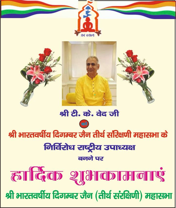 दिगंबर जैन समाज इंदौर के एवं पुर्व दिगंबर जैन सोशल ग्रुप फेडरेशन के राष्ट्रीय अध्यक्ष जैन समाज गोरव परम मुनि भक टीके वेद श्री भारत वर्षीय दिगम्बर जैन तीर्थ संरक्षिणी महासभा के निर्विरोध राष्ट्रीय उपाध्यक्ष चुने गए। धर्म समाज प्रचारक राजेश जैन दद्दू ने कहा कि वेद साहब के राष्ट्रीय उपाध्यक्ष बनने से भारत वर्षीय जैन समाज हर्षित हुआ। आप के मनोनीत होने पर महावीर ट्रस्ट के अध्यक्ष अमित कासलीवाल फेडरेशन के राष्ट्रीय अध्यक्ष मनोहर झांझरी वरिष्ठ समाजसेवी डॉ जैनेन्द्र जैन आजाद जी जैन हंसमुख गांधी सुशील पांड्या नरेंद्र वेद मंयक जैन सुभाष काला एवं फेडरेशन की राष्ट्रीय शिरोमणि संरक्षिका श्रीमती पुष्पा कासलीवाल श्रीमती रेखा जैन श्रीफल आदि समाज जन ने बधाई दी ।