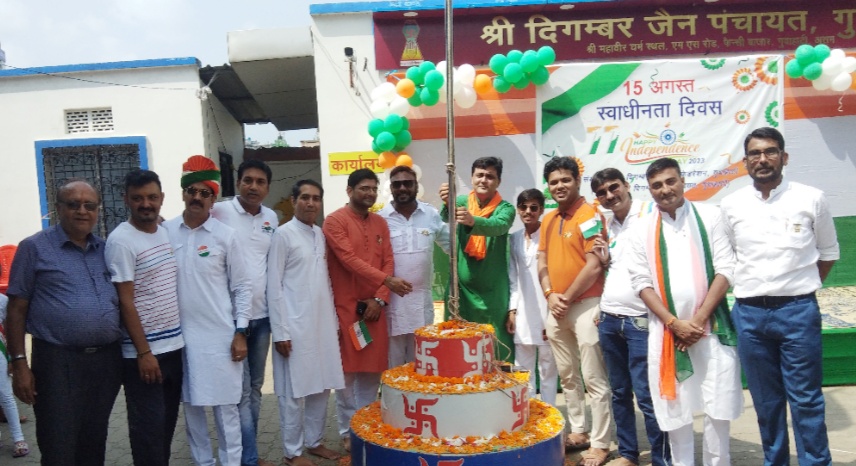 गुवाहाटी: श्री दिगंबर जैन यूथ फेडरेशन( अंतर्गत श्री दिगंबर जैन पंचायत, गुवाहाटी) के तत्वधान में मंगलवार को विभिन्न कार्यक्रमों के साथ 77 वा स्वाधीनता दिवस मनाया गया। प्रचार प्रसार विभाग के मुख्य संयोजक ओम प्रकाश सेठी ने बताया की आचार्य श्री प्रमुख सागर महाराज ससंग के सानिध्य में सुबह 8:45 बजे समाज के वाइस चेयरमैन महावीर प्रसाद छाबड़ा एवं अध्यक्ष महावीर जैन (गंगवाल)ने ध्वजारोहण किया। तत्पश्चात आचार्य जी ने उपस्थित श्रद्धालुओं को संबोधित करते हुए कहा कि हमारे राष्ट्र की सुरक्षा के लिए सीमा पर सैनिक हर पल अलर्ट रहता है। ठीक उसी प्रकार आपको भी आत्म स्वतंत्रता के लिए हर पल अलर्ट रहना पड़ेगा। आचार्य श्री ने कहा की कोशिश करो कि कषाय के द्वारा पाप बंध न हो। जब देश प्रेम के साथ आत्मा के प्रति आकर्षण बढ़ेगा तभी आत्म स्वरूप की प्राप्ति होगी। इस मौके पर समाज के बच्चों ने सांस्कृतिक कार्यक्रम प्रस्तुत कर उपस्थित सभी लोगों का मन मोह लिया। कार्यक्रम को सफलतापूर्वक आयोजन कराने में यूथ के अध्यक्ष सौरभ अजमेरा, कार्याध्यक्ष विकास विनायक्या, आशीष भरतीय, सुशील ठोलिया, भरत बड़जात्या, जितेंद्र पांड्या,