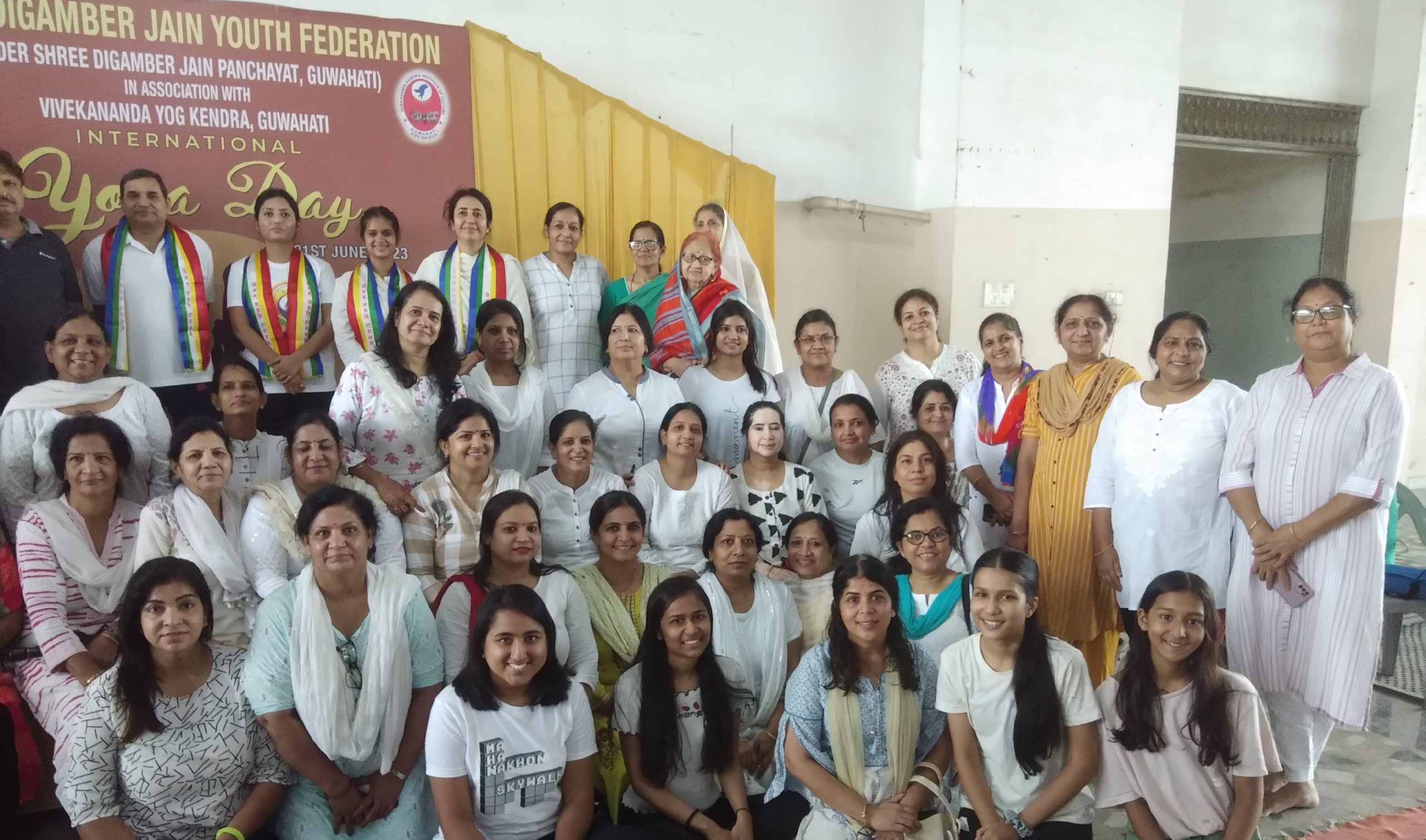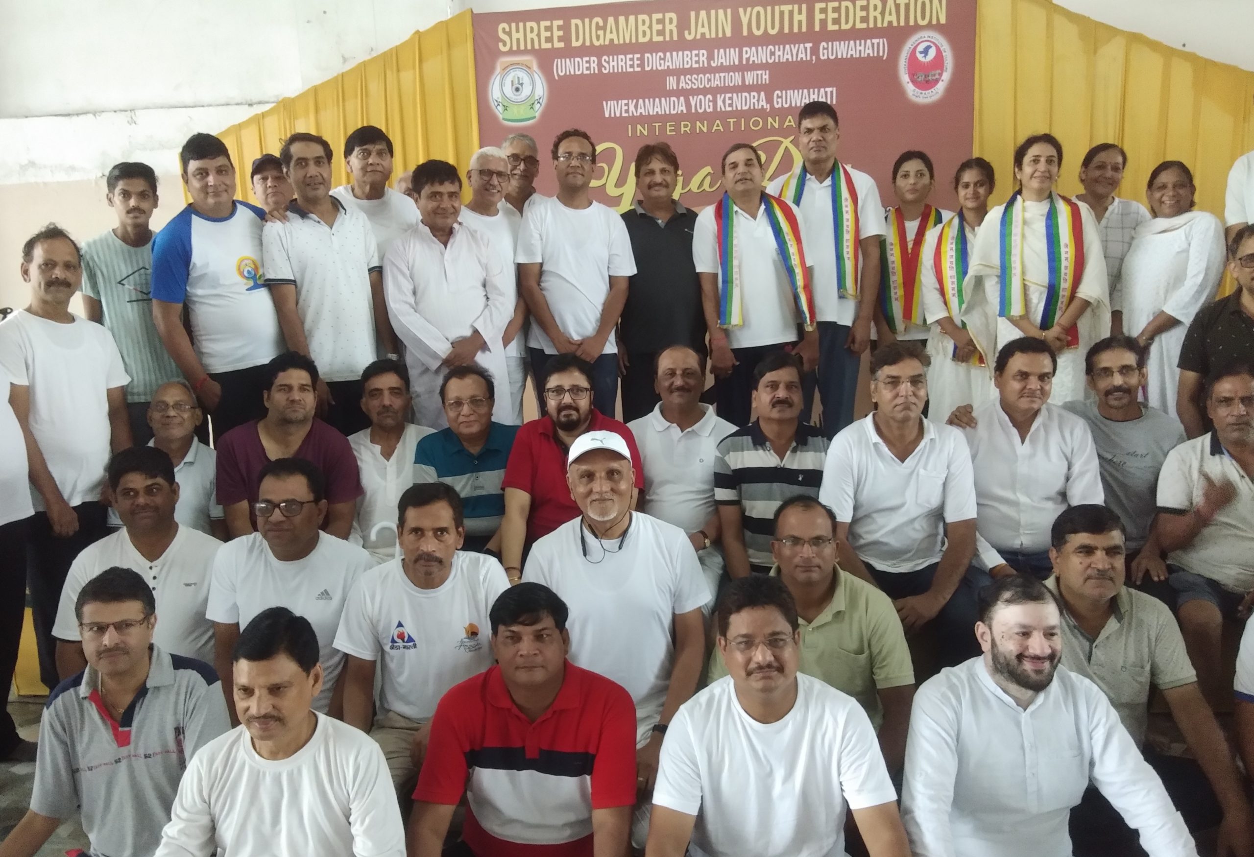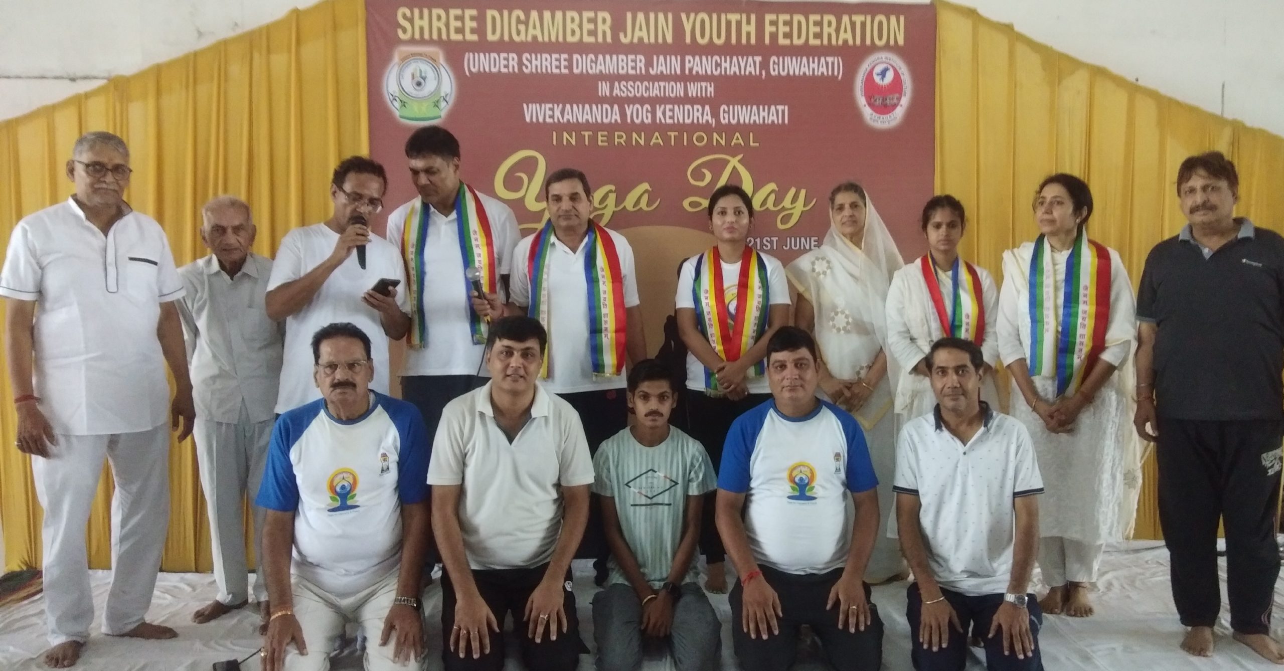 श्री दिगंबर जैन यूथ फेडरेशन (अंतर्गत दिगंबर जैन पंचायत गुवाहाटी)* के सौजन्य से तथा *श्री विवेकानंद योग केंद्र गुवाहाटी* के सहयोग से स्थानीय ए.टी. रोड स्थित *महावीर भवन धर्मस्थल* में आज *अंतर्राष्ट्रीय योग दिवस* का आयोजन किया गया । इस अवसर पर करीब 150 पुरुष, महिलाओं एवं बच्चों ने शिविर में हिस्सा लेकर योग का लाभ उठाया। इस अवसर पर *श्री विवेकानंद योग केंद्र गुवाहाटी के प्रशिक्षित योग गुरु अजय अग्रवाल* ने कहा की योग बेहतर जीवन जीने में हमारी काफी सहायता करता है तथा स्वस्थ रहने के लिए योग को अपनी जीवन शैली में शामिल करना ही होगा। शिविर को सफलतापूर्वक आयोंजन करने में विवेकानंद योग केंद्र के पारिजात देव, मनोहर शर्मा, संगीता जैन ,बंदना कुमारी, श्री दिगंबर जैन पंचायत के वाइस चेयरमैन मानिकचंद झंझरी, उपाध्यक्ष ओम प्रकाश सेठी कार्यक्रम संयोजक विपिन सोगानी, सुनील पहाड़िया एव यूथ फेडरेशन के कार्याध्यक्ष विकास बिनाक्या, जितेंद्र पांडया ,आशीष जैन,जितेंद्र गंगवाल आदि लोगों का विशेष सहयोग रहा। यह जानकारी समाज के प्रचार प्रसार विभाग के मुख्य संयोजक ओम प्रकाश सेठी व सह संयोजक सुनील कुमार सेठी द्वारा दी गई है।।