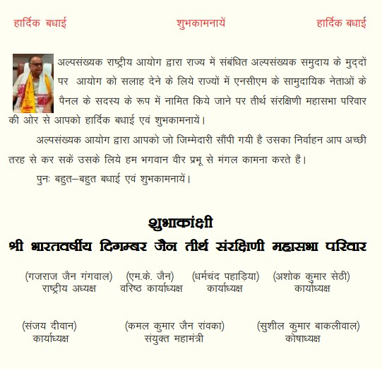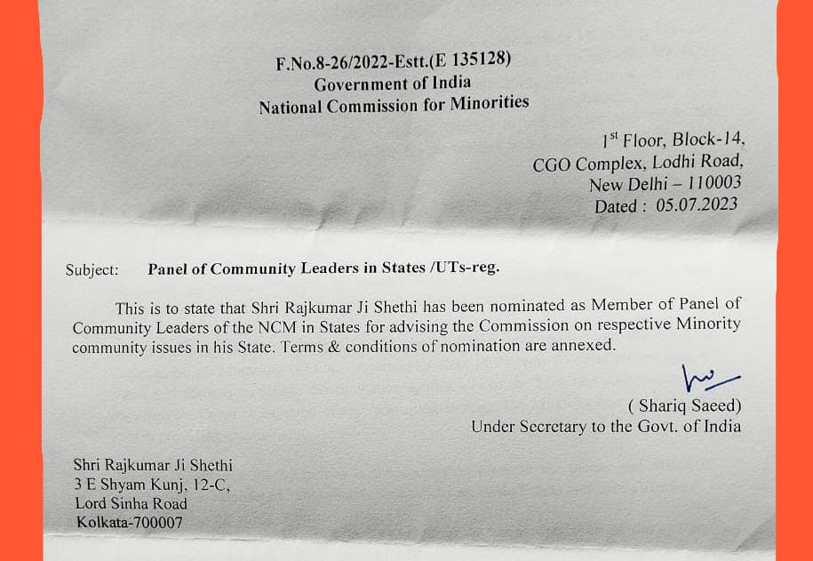 श्री राजकुमार जी सेठी को राष्ट्रीय अल्पसंख्यक आयोग द्वारा राज्य के लिये कम्युनिटी लिडर्स के पेनल में सदस्य के रुप में नामांकित किया गया है