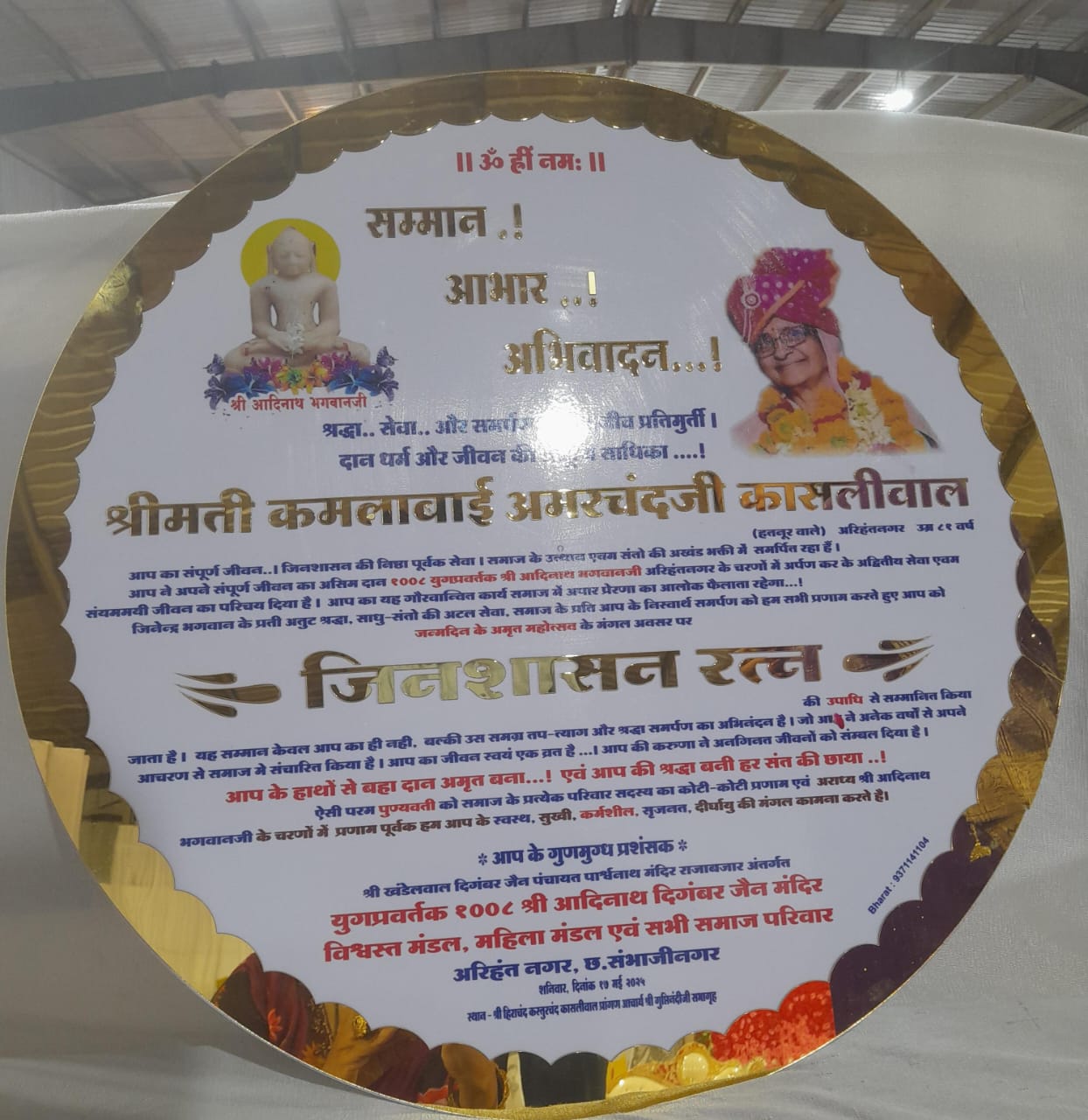 औरंगाबाद समाज की ओर से ऊसके अमृत महोत्सव के अवसरपर कमलबाई को जिनशासन रत्न