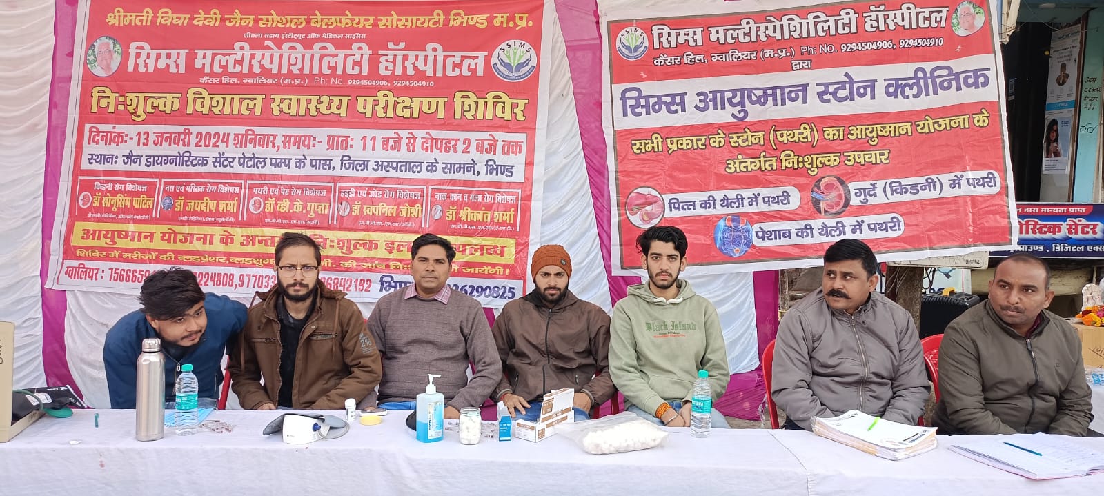 दिनांक:- 13 जनवरी 2024 शनिवार, भिंड नगर के जिला अस्पताल के सामने जैन डायग्नोस्टिक सेंटर, पेट्रोल पंप के पास, श्रीमती विद्या देवी जैन सोशल वेलफेयर सोसायटी भिण्ड द्वारा निःशुल्क विशाल स्वास्थ्य परीक्षण शिविर लगाया गया जिसमे सिम्स मल्टीस्पेशिलिटी हॉस्पीटल कैंसर हिल ग्वालियर द्वारा स्वास्थ्य परीक्षण शिविर लगाया गया जिसमे डॉ. व्ही. के. गुप्ता,