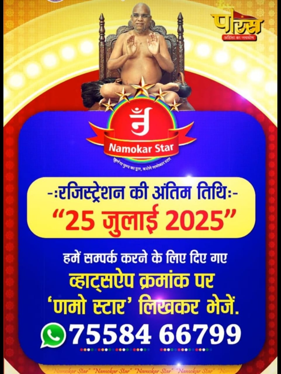 स्टार प्रतियोगिता इस प्रतियोगिता में रोज दोपहर तीन बजकर बीस मिनिट से श्री 108 देवनन्दी जी गुरुदेव के पारस टीवी पर प्रवचन होंगे ,उस प्रवचन के बाद एक सवाल पूछा जायेगा उस सवाल का जबाब देने हेतु आपको णमोकार तीर्थ व्हाट्सप्प ग्रुप सेणमोकार तीर्थ प्रणेता आचार्य देवनन्दी जी महाराज के आशर्वाद से आज से शरू हुयी णमोकार हर रोज तीन बजकर तीस मिनिट पर एक लिंक के माधयम से सही उत्तर देना पड़ेगा ,पूछे गए प्रश्न का जो भी श्रावक सबसे पहले सही उत्तर देगा वह होगा णमोकार तीर्थ स्टार प्रतियोगिता का विजेता और उस विजेता को प्राप्त होगा एक चांदी सिक्का ,इस प्रतियोगिता से बहुत से लोगो का रुझान गुरूजी की उस धर्म यात्रा में लग रहा है जिससे जैन धर्म का प्रचार प्रसार भी हो रहा है |