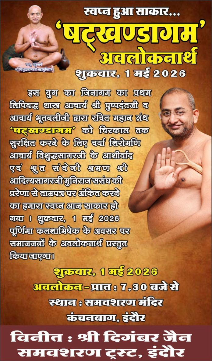 इंदौर, दिगंबर जैन परंपरा के प्रथम लिपिबद्ध ग्रंथ शास्त्र ‘षट्खण्डागम’ को चिरकाल तक सुरक्षित रखने का स्वप्न साकार हो गया है। आचार्य श्री पुष्पदंत जी एवं आचार्य भूतबली जी द्वारा रचित इस महान ग्रंथ को ताम्रपत्र पर अंकित कर संरक्षित किया गया है। धर्म समाज प्रचारक राजेश जैन दद्दू ने कहा कि श्रंमण संस्कृति के महामहिम पट्टाचार्य आचार्य चर्चा शिरोमणि आचार्य श्री 108 विशुद्धसागर जी महाराज* के मंगल आशीर्वाद एवं कुल गोरव मुनि श्रुत संवेगी श्रमणमुनि श्री आदित्यसागर जी महाराज ससंघ की प्रेरणा एवं मार्गदर्शन से यह ऐतिहासिक कार्य संपन्न हुआ है।
