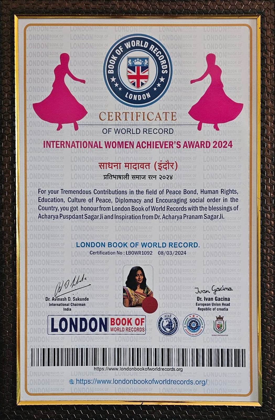 अंतर्राष्ट्रीय वूमन्स अचीवर्स अवार्ड 2024: लंदन बुक ऑफ वर्ल्ड रिकॉर्ड इंदौर की श्रीमती साधना मादावत जैन रंगशाला प्रॉडक्शन को प्रदान किया गया इस अवॉर्ड के लिए अपने अपने क्षेत्र की विशिष्टता को लिए 48 महिलाओं को चुना गया