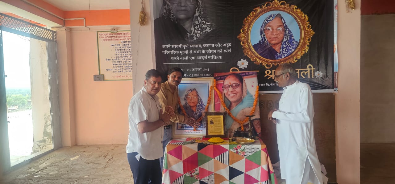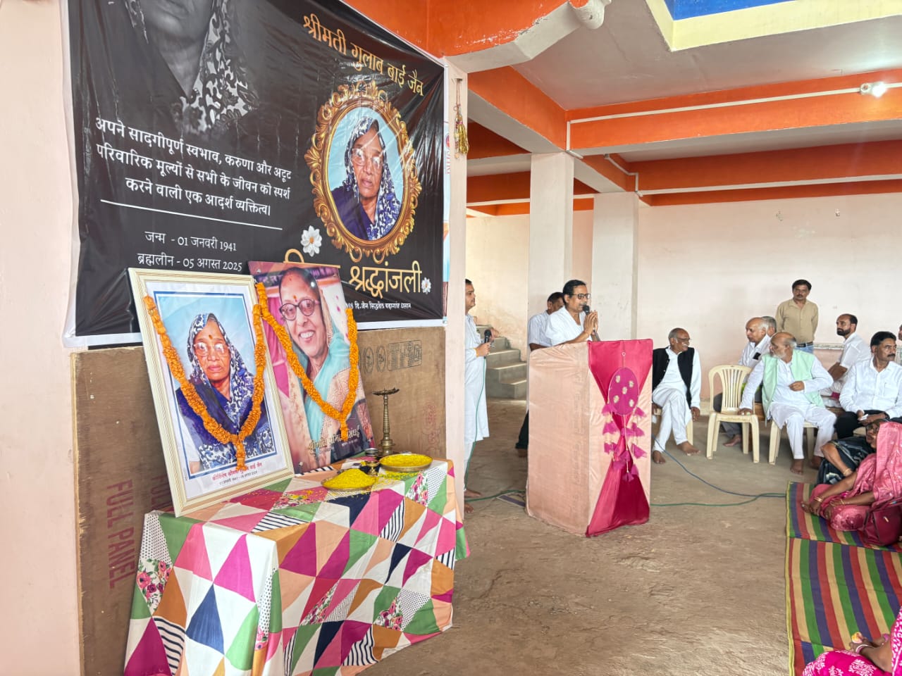 घुवारा / जो जीव इस संसार मे आया है निश्चित तौर पर उसे तो जाना ही है क्योंकि यह शरीर नश्वर है यूं तो संसार मे लाखों लोग जन्म और मरण को प्राप्त होते हैं लेकिन वह विरले ही होते हैं जिन्हें हमेशा याद किया जाता है, सभा की शुरुआत स्वर्गीय गुलाब बाई के जी के पुत्र धरनेंद्र जैन और परिवार के सदस्य श्री सुरेश जैन, श्री महेंद्र जैन एवं परिवार के सभी सदस्यों ने दीप प्रज्वलन कर और मंगलाचरण कर सभा का संचालन गगनदीप फणीन्द पार्षद ने किया मां गुलाब बाई के ऊपर परिवार के नौ सदस्यों के भरण पोषण का पूरा भार था सभी जिम्मेदारियां को निभाते हुए अपने बेटे को इतना योग्य बनाया कि आज जिले के सर्वोच्च पद कलेक्टर के पद पर आसीन है श्रद्धांजलि सभा में अनेक जनों ने अपने श्रद्धा सुमन अर्पित किए और मां गुलाब बाई के जीवन से जुड़े संस्मरणों को बात कर उन्हें याद किया !