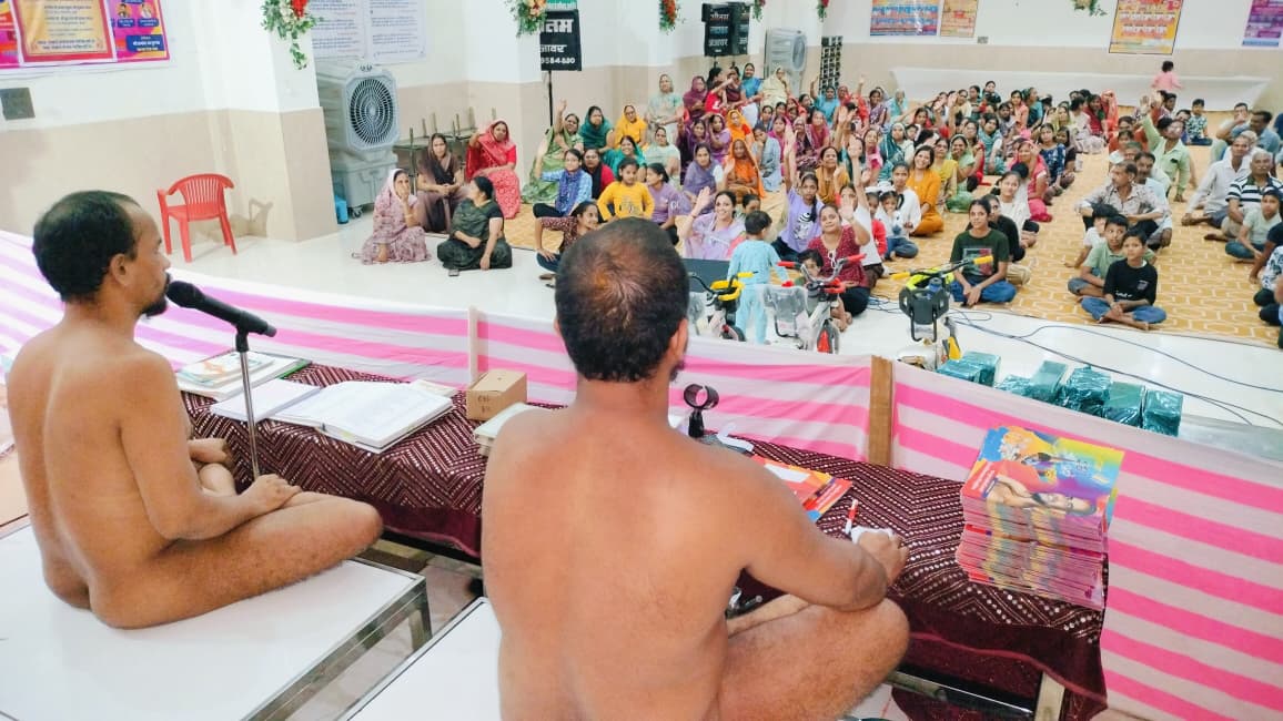 जैन संत ने छोटे-छोटे बच्चों का धर्म का ज्ञान सिखाया णमोकार महामंत्र बोलकर सदैव सच ही बोलना झूठ से हमेशा दूर रहना सच बहुत ताकतवर है झूठ बहुत कमजोर होता है