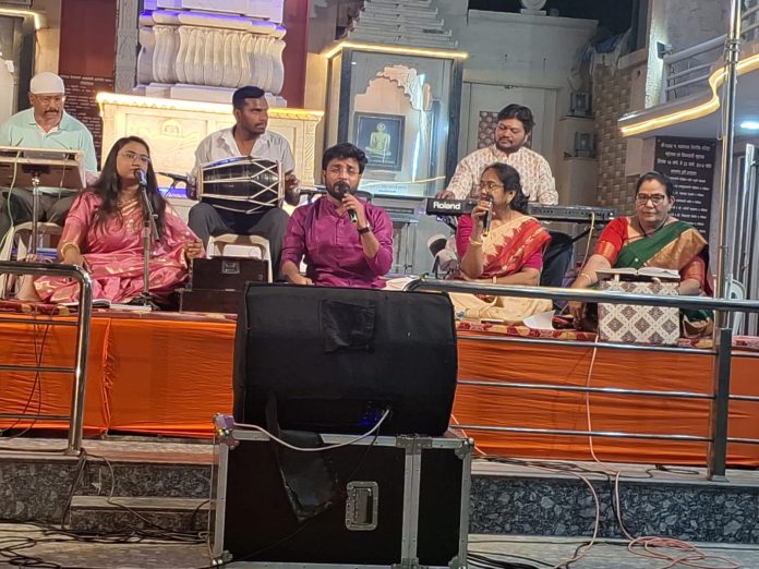 गायक कलाकार डॉ. श्रुति पांडवकर, डॉ. अंजुषा पांडवकर, प्रतीक सावलकर ने भक्ति गीतों की श्रृंखला में सुमधुर भक्ति गीत प्रस्तुत किए। गीतों ने उपस्थित श्रोताओं को गोते लगाने के लिए विवश किया। बाल तीर्थंकर को पालने में झुलाया गया। बधाई गीत गाएं गए। वीर वंदना का शुभारंभ णमोकार महामंत्र के गीत से हुआ। ‘सत्य अहिंसा त्याग धर्म हा जगती असे महान’, ‘सुन लो वीरा’, ‘ महावीरा कब से खड़ी तेरे द्वार’, ‘ मधुबन के मंदिरों में भगवान बस रहा हैं’, ‘ ऐसी लागी लगन’, ‘सजा दो घर को गुलशन का’, ‘तेरा मन दर्पण कहलाएं’, ‘डोलीवाले कहते हर इक से’, ‘चौरासी लाख मंत्रों का सरताज हैं’, ‘अब उठो सखी श्रृंगार करो’, यह गीतों की प्रस्तुति हुई।