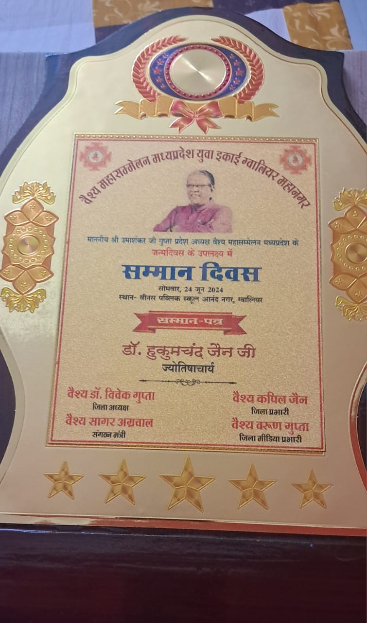 ज्योतिषाचार्य डॉ हुकुमचंद जैन को ज्योतिष के क्षेत्र में किए गए उत्कृष्ठ व उल्लेखनीय कार्यों के लिए सम्मानित किया गया।