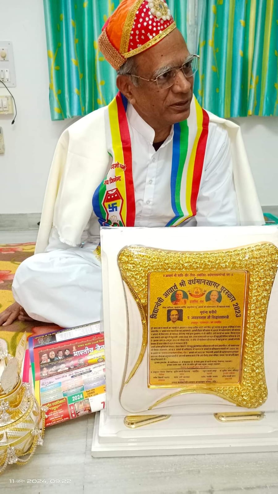 बहुमुखी विशिष्ठ व्यक्तित्व के धनी परम आदरणीय पं. श्री जवाहर लाल जी भीण्डर (राजस्थान) को चा.च. आचार्य श्री शांतिसागर जी महाराज के आचार्य पद प्रतिष्ठापना शताब्दी वर्ष के अवसर पर प्रभावना जनकल्याण परिषद (रजि.) द्वारा वर्ष 2023 का ‘विद्यान्वेषी आचार्य श्री वर्द्धमानसागर पुरस्कार’ प्रदान करने के अवसर के दौरान मुझे उनके साक्षात् दर्शन का सौभाग्य प्राप्त हुआ। पुरस्कार समर्पण समारोह का आयोजन परम पूज्य वात्सल्य वारिधि आचार्य श्री वर्द्धमानसागर जी महाराज के सान्निध्य में सलूम्बर राजस्थान में 10 जनवरी 2024 को था। वे पुरस्कार आदि लेते नहीं थे लेकिन उनसे विशेष अनुरोध करने पर वह तैयार हो गए लेकिन वह पुरस्कार राशि ग्रहण नहीं करेंगे ऐसा संदेश प्राप्त हुआ। वे अस्वस्थता की वजह से सलूम्बर आयोजन स्थल पर नहीं पहुँच सके तो पूज्य आचार्यश्री के आशीर्वाद से हम लोग उनके निज निवास सर्व ऋतु विलास, उदयपुर राजस्थान 11 जनवरी 2024 को प्रातः पहुँच गए। अस्वस्थता की वजह से आदरणीय पंडित जी के पास किसी भी व्यक्ति को पूर्व समय लेकर जाना होता था। लेकिन जैसे ही उन्हें पता लगा हम लोग आना चाहते हैं उन्होंने तुरन्त संदेश पहुँचाया विद्वानों का समागम उन्हें बहुत अच्छा लगता है , आप लोग किसी भी समय आ जाएं। हम लोग उनके निवास पर पहुँचे, उन्होंने हम लोगों को जो वात्सल्य, स्नेह, मार्गदर्शन प्रदान किया उसे शब्दों में बयां नहीं किया जा सकता। कुछ नजदीकी रिश्तेदार भी आ गए थे। विधिवत रूप से पुरस्कार स्वरूप प्रशस्ति पत्र, अंग वस्त्र, साहित्य, पगड़ी ,माला,श्रीफल, रजत कलश भेंट करने के बाद आदरणीय पंडितजी से तत्त्व चर्चा आरंभ हुई। मुझे करीब 20 मिनिट तक उनका साक्षात्कार लेने का अपूर्व अवसर प्राप्त हुआ, जिसकी रिकार्डिंग भी की गई। उन्होंने बताया कि आदरणीय पंडित रतनलाल जी मुख्तार सहारनपुर उनके गुरु थे, उन्होंने ( पंडित रतनलाल जी मुख्तार) करणानुयोग प्रभाकर सिद्धांत कोष बनाने में अपने जीवन के 33 साल लगाए , इसमें शंकाऒ के समाधान दिए गए हैं। पंडित जी ने बताया कि उन शंका समाधान के संपादन में उन्होंने अपनी जवानी के 15 लगा दिए यानी पूरा यौवन इसमें लगा दिया। उन्होंने बताया कि जैनेंद्र सिद्धांत कोष को तैयार करने में जिनेन्द्र वर्णी जी को 17 वर्ष लगे थे, (जिनेन्द्र वर्णी जी के गुरु भी पंडित रतनलाल जी मुख्तार थे) लेकिन यह इतिहास की एक अनोखी घटना थी जो करणानुयोग प्रभाकर तैयार करने में कुल 48 वर्ष लगे। 33 वर्ष गुरु जी यानि पंडित रतनलाल जी मुख्तार व 15 वर्ष मुझे। धवला के 16341 पृष्ठों में यह समाहित है। वे यह सब सुनाते हुए भावुक भी हुए और अपने गुरु को श्रद्धा पूर्वक स्मरण करते हुए उन्होंने कहा कि विद्वानों के द्वारा की गई साहित्य सपर्या भी एक बहुत बड़ी साधना है। समा